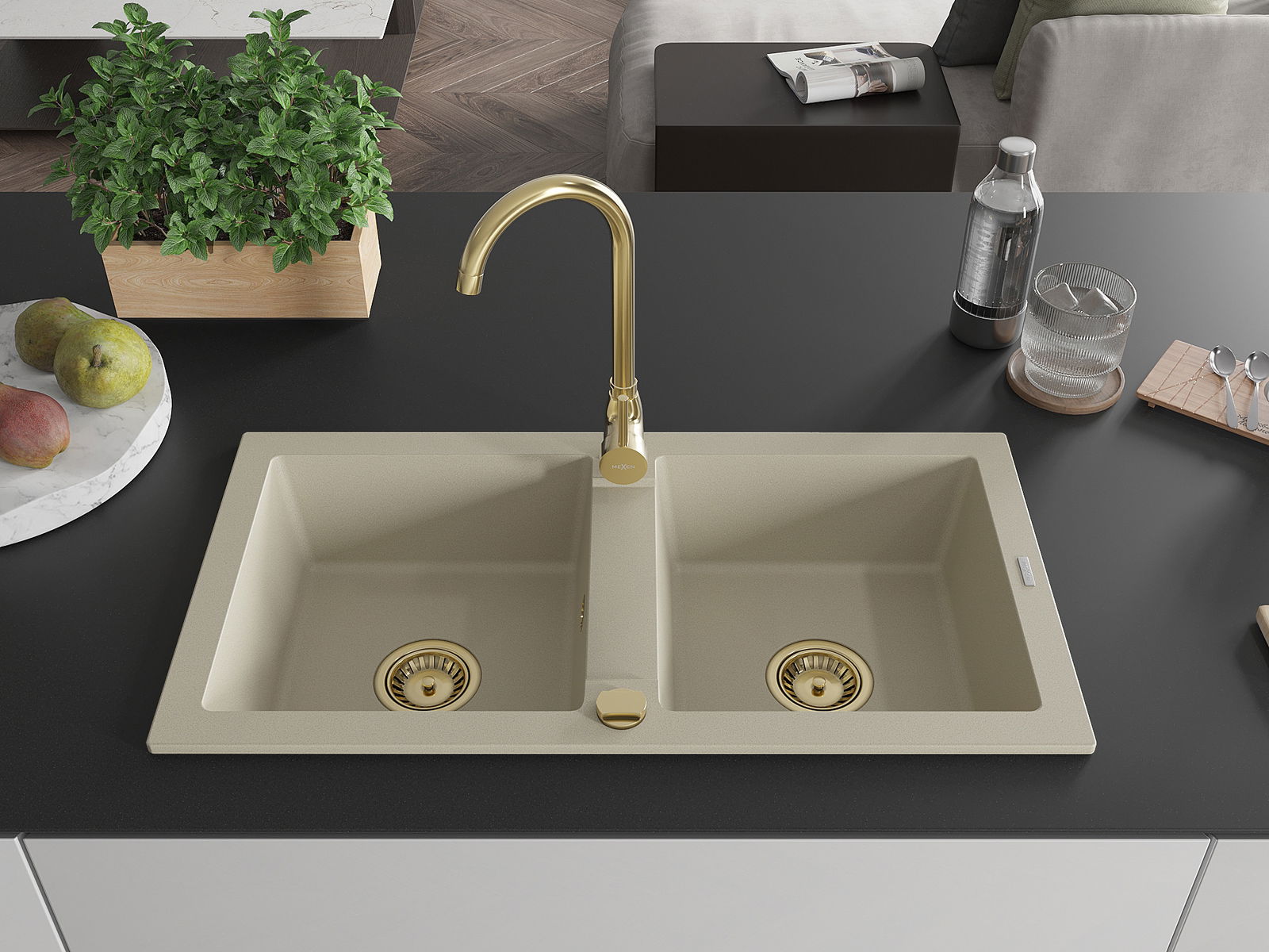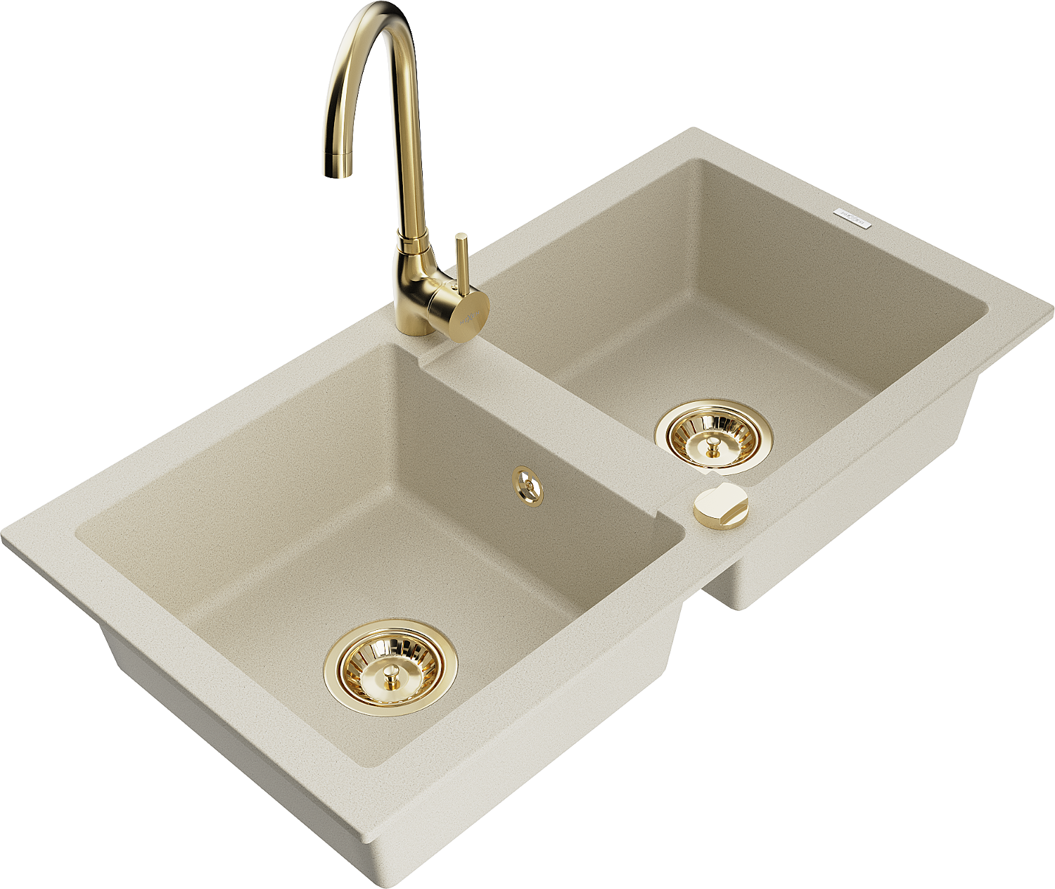 Mexen Mario dvoukomorový žulový dřez s kuchyňskou baterií Telma, béžový - 6504-69-670200-50