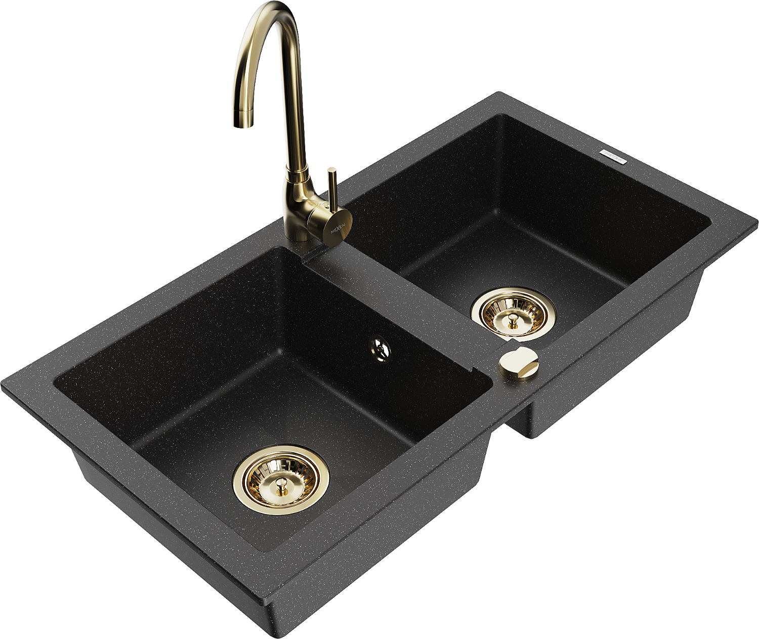 Mexen Mario granitový dřez 2-komorový s kuchyňskou baterií Telma, černý/stříbrný - 6504-73-670200-50