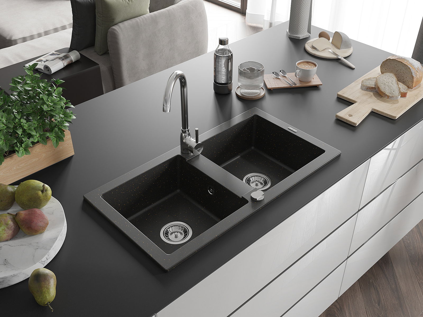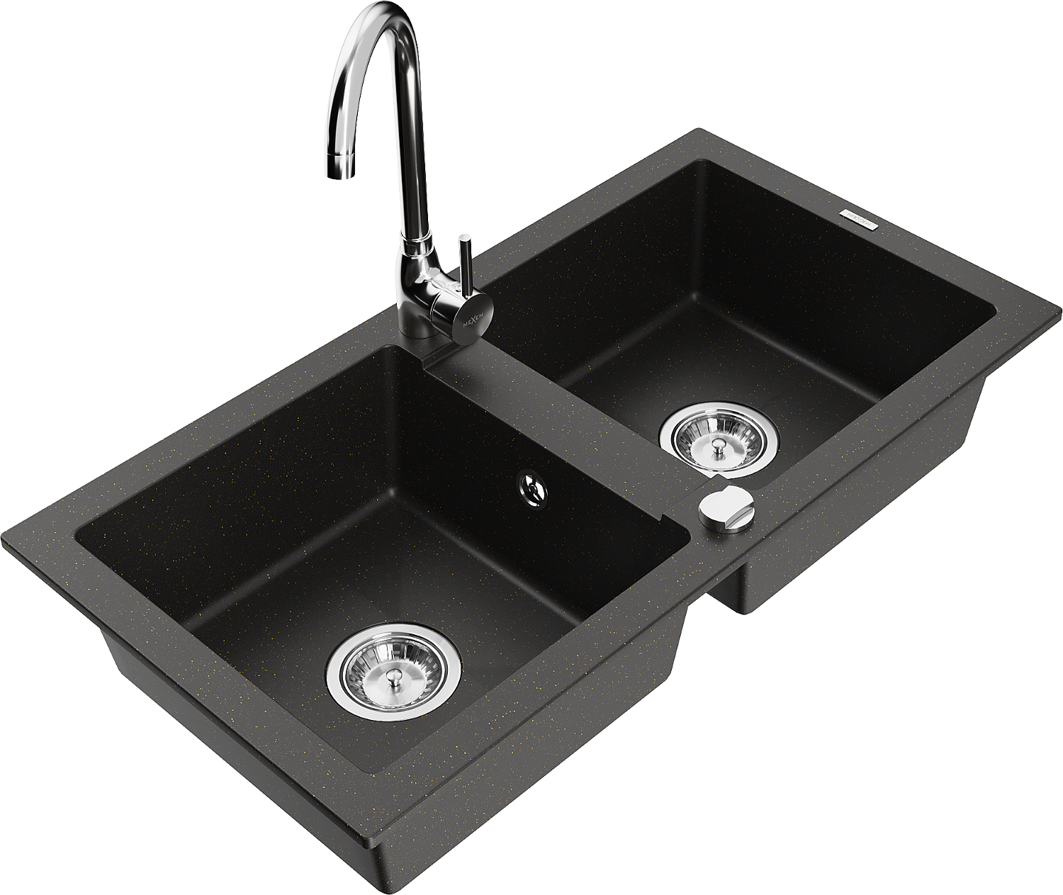 Mexen Mario žulový dřez s 2 komorami s kuchyňskou baterií Telma, černá/zlatá - 6504-75-670200-00