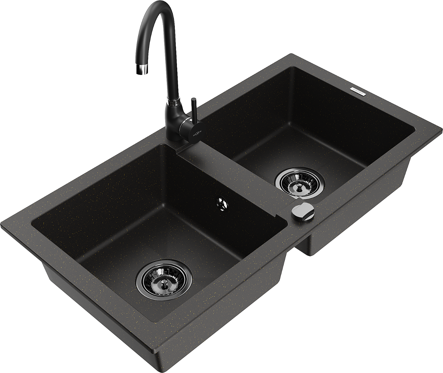 Mexen Mario dvoudřezový žulový dřez s kuchyňskou baterií Telma, černý/zlatý - 6504-75-670200-70-B