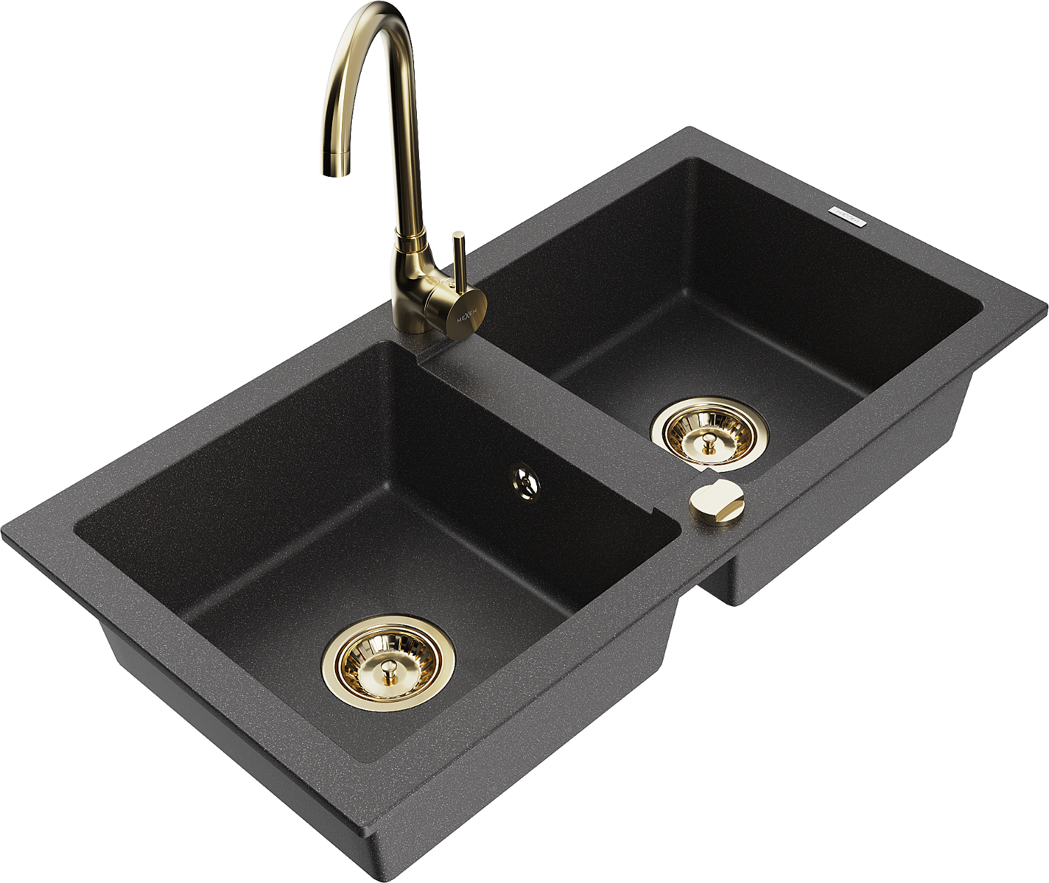 Mexen Mario granitový dřez 2-komorový s kuchyňskou baterií Telma, černý skvrnitý - 6504-76-670200-50