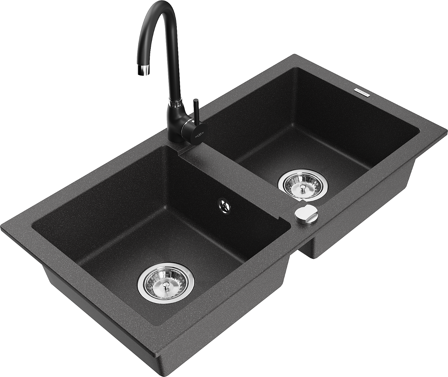 Mexen Mario granitový dřez 2-komorový s kuchyňskou baterií Telma, černý s tečkami - 6504-76-670200-70