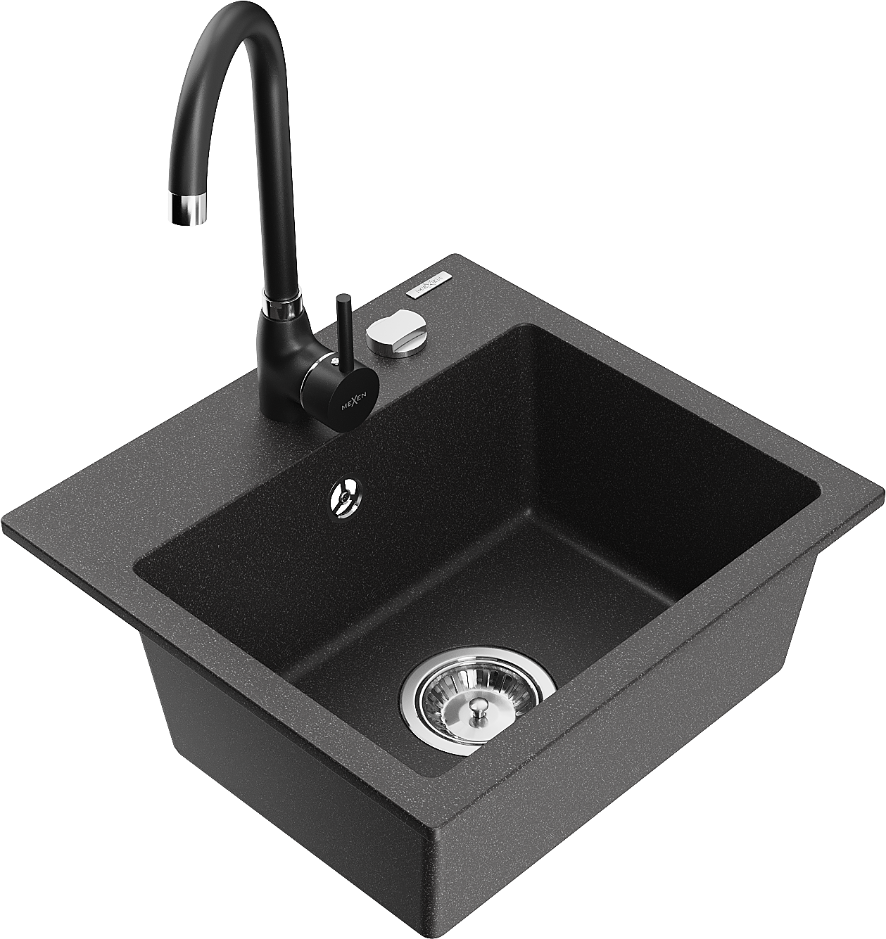 Mexen Milo granitový dřez 1-komorový s kuchyňskou baterií Telma, černý kropenatý - 6505-76-670200-70