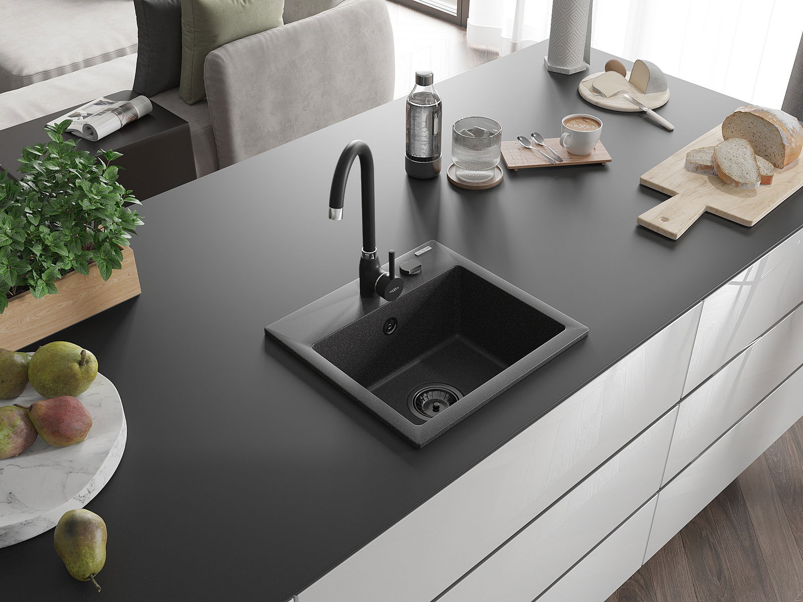 Dřez má předfrézovaný otvor o průměru 35 mm k samostatnému proražení. Může být použit například k montáži dávkovače na tekutinu, který eliminuje přítomnost plastových lahví v kuchyni a dodá jí elegantní finiš.