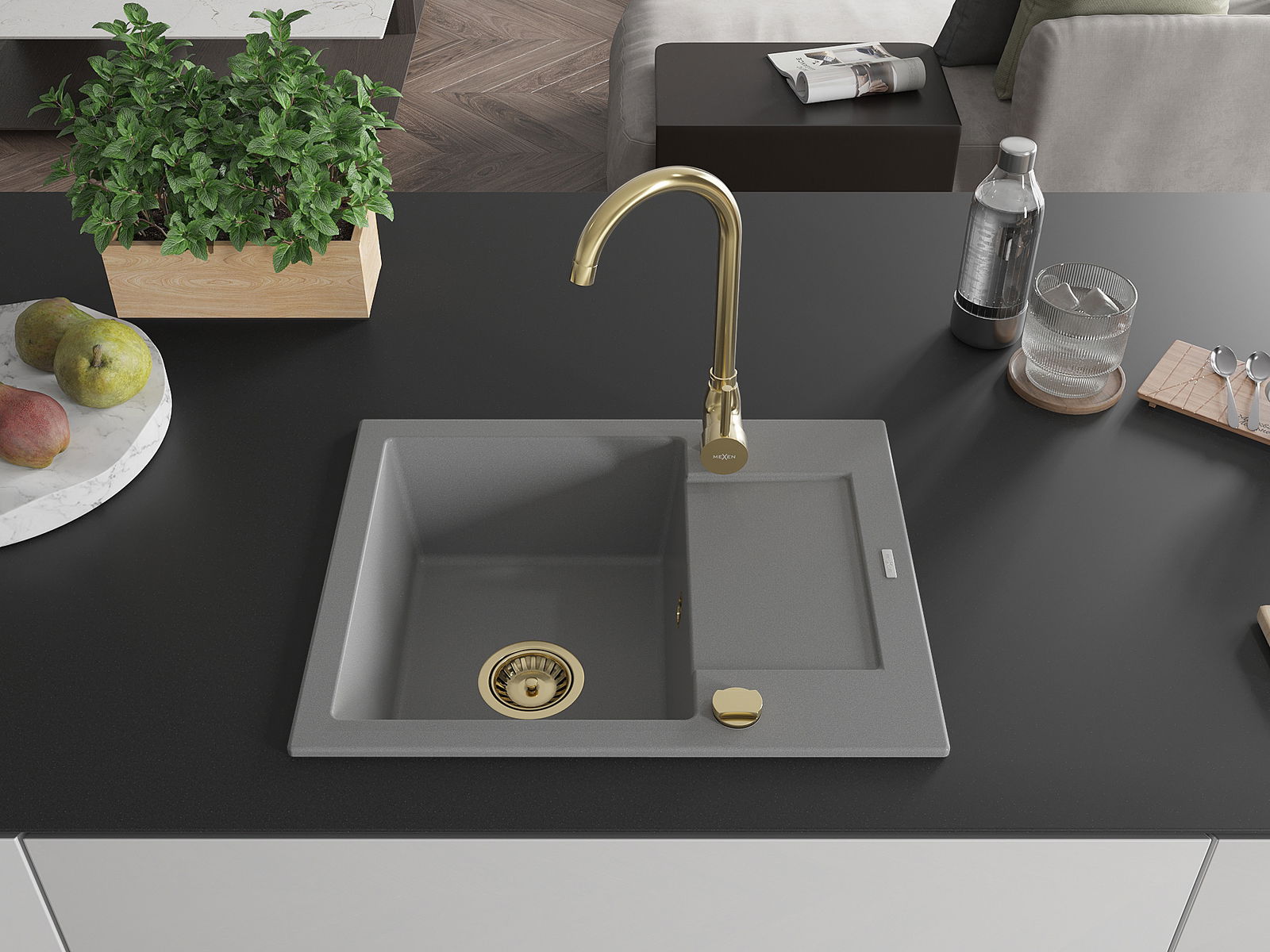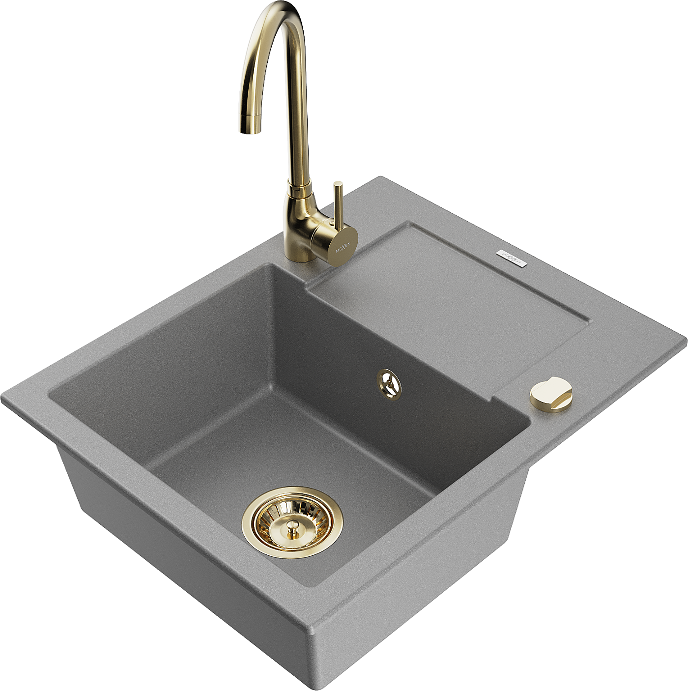 Mexen Enzo granitový dřez 1-komorový s odkapávačem a kuchyňskou baterií Telma, šedý - 6506-71-670200-50