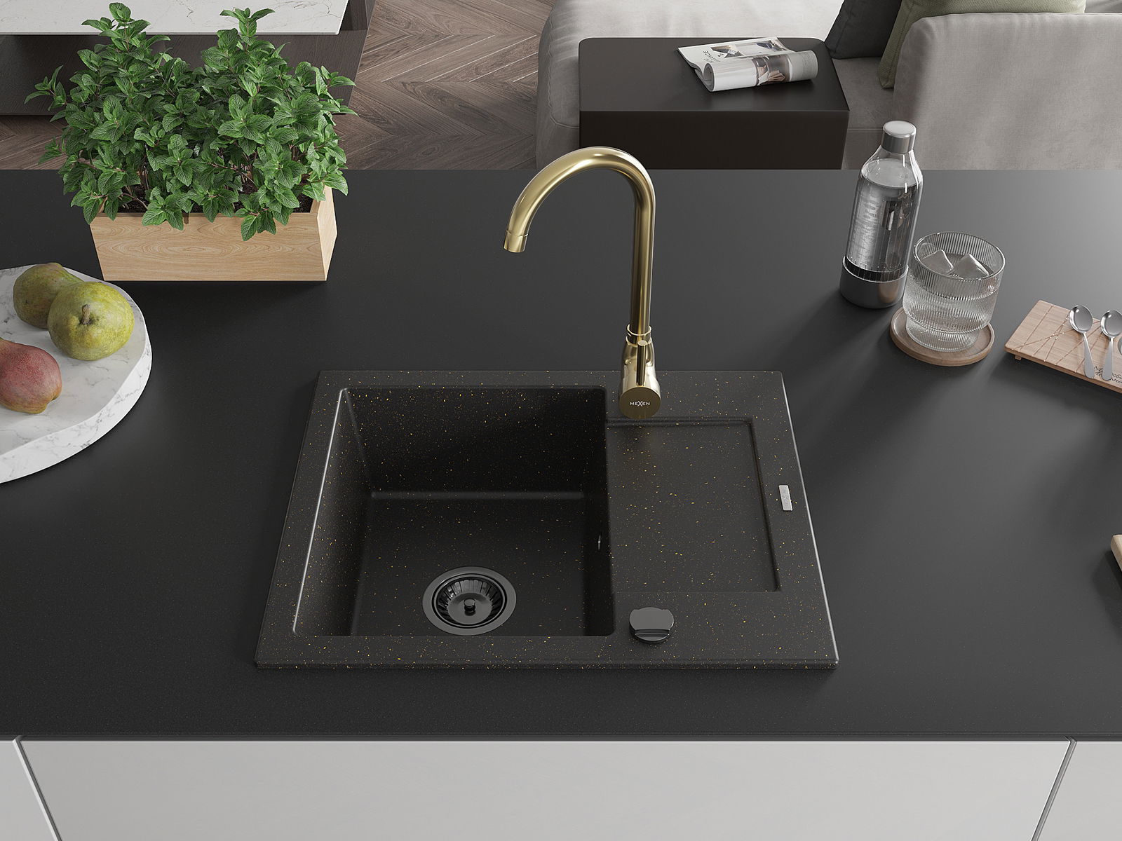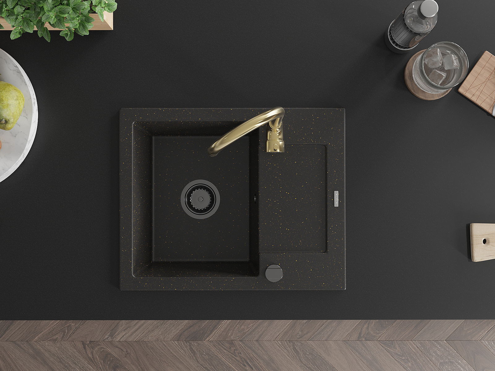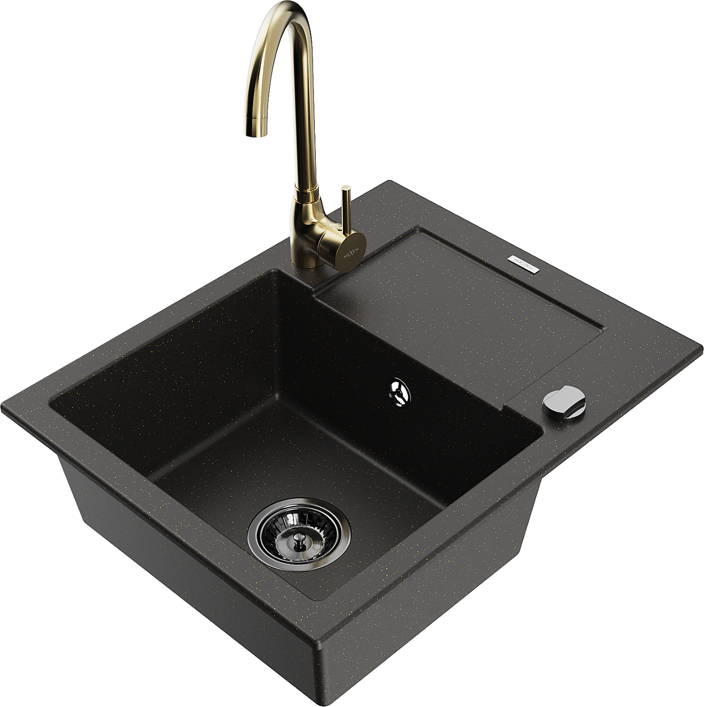Mexen Enzo granitový dřez 1-komorový s odkapávačem a kuchyňskou baterií Telma, černý/zlatý - 6506-75-670200-50-B