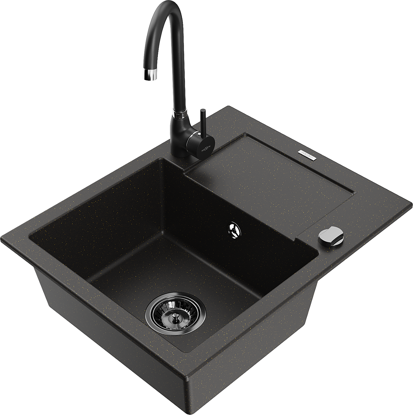 Mexen Enzo granitový dřez s 1 komorou, odkapávačem a kuchyňskou baterií Telma, černý/zlatý - 6506-75-670200-70-B