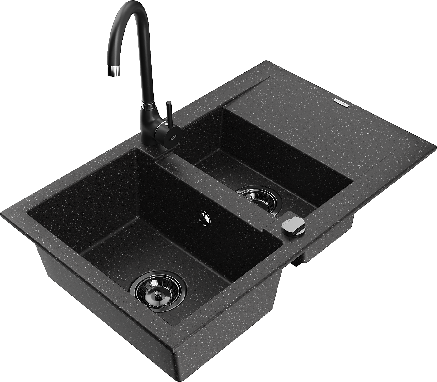 Mexen Gaspar granitový dřez 1,5 komorový s odkapávačem a kuchyňskou baterií Telma, černý/stříbrný - 6507-73-670200-70-B