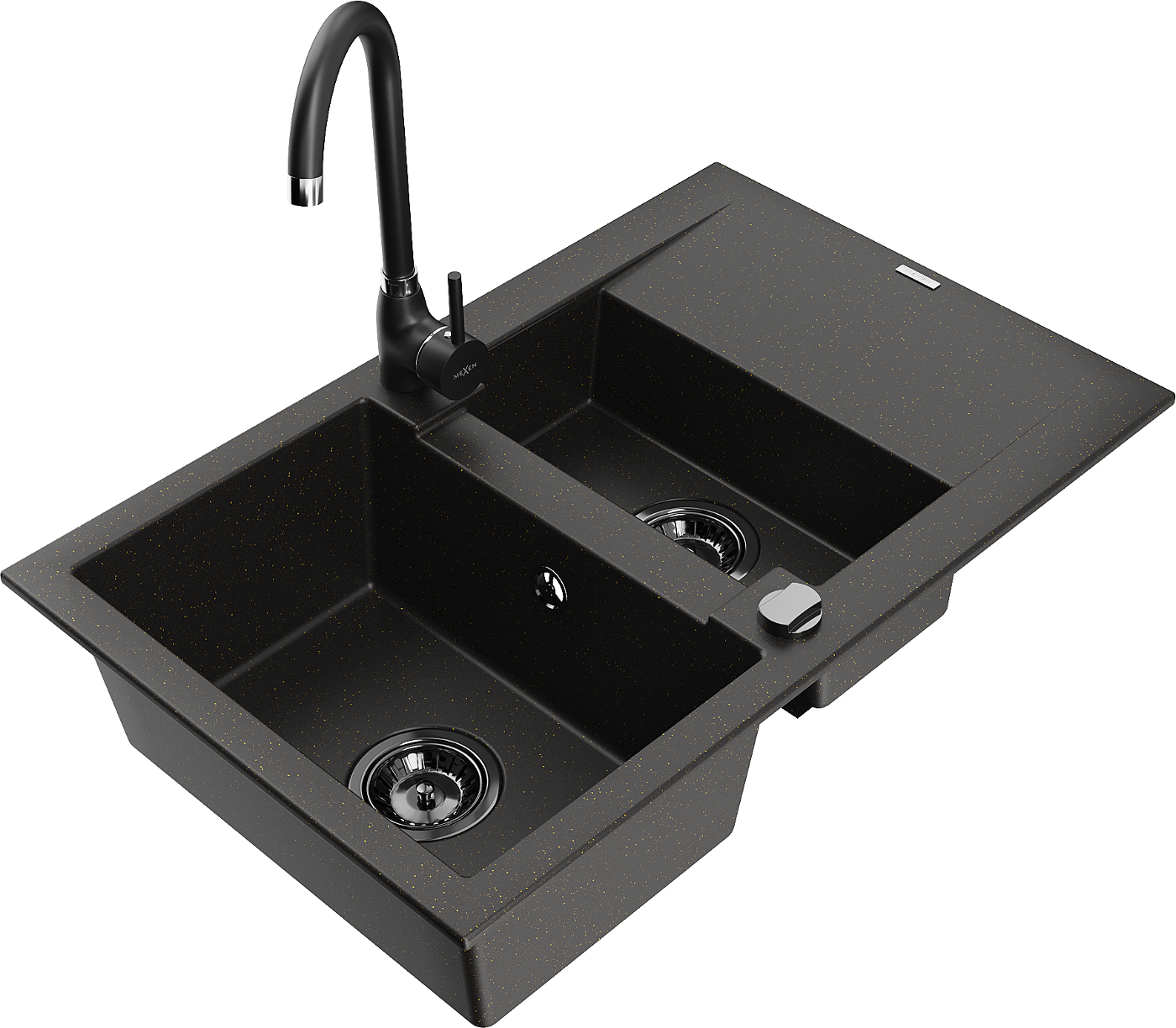 Mexen Gaspar granitový dřez 1,5-komorový s odkapávačem a kuchyňskou baterií Telma, černý/zlatý - 6507-75-670200-70-B