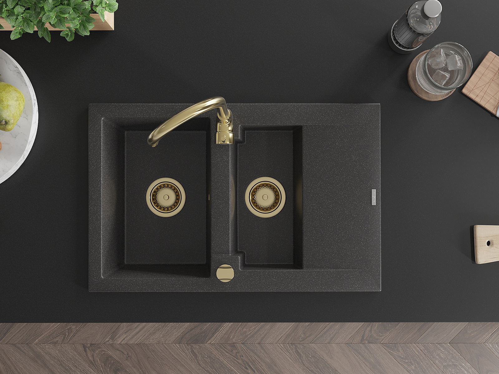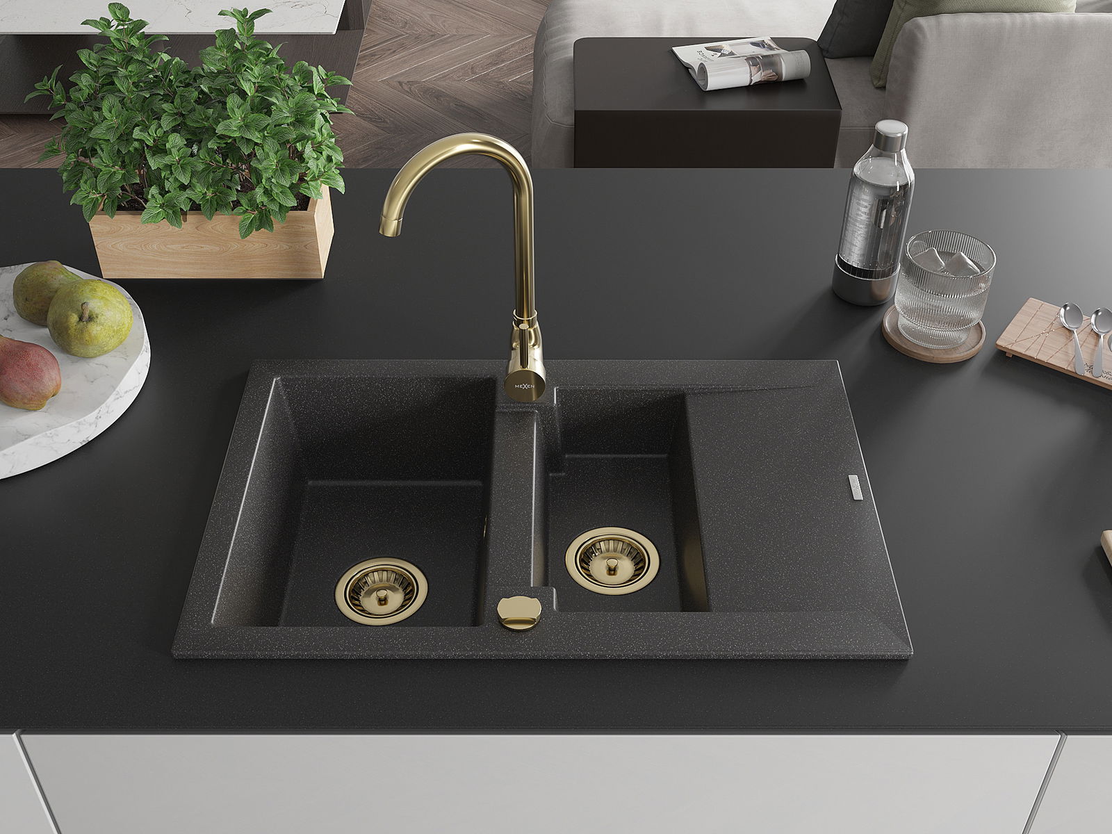 • Mexen Gaspar granitový dřez 1,5-komorový s odkapávačem a kuchyňskou baterií Telma, černý skvrnitý - 6507-76-670200-50
