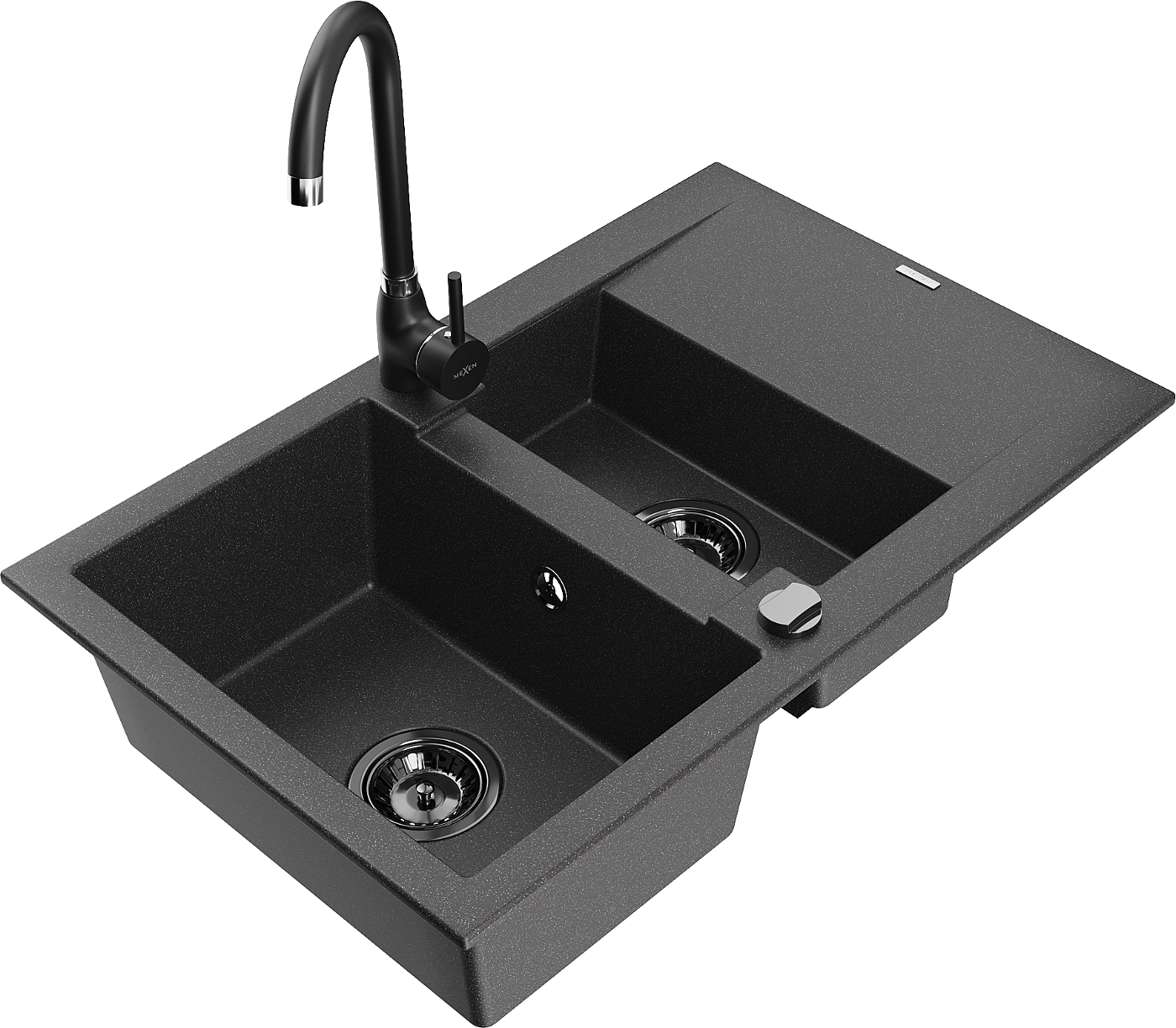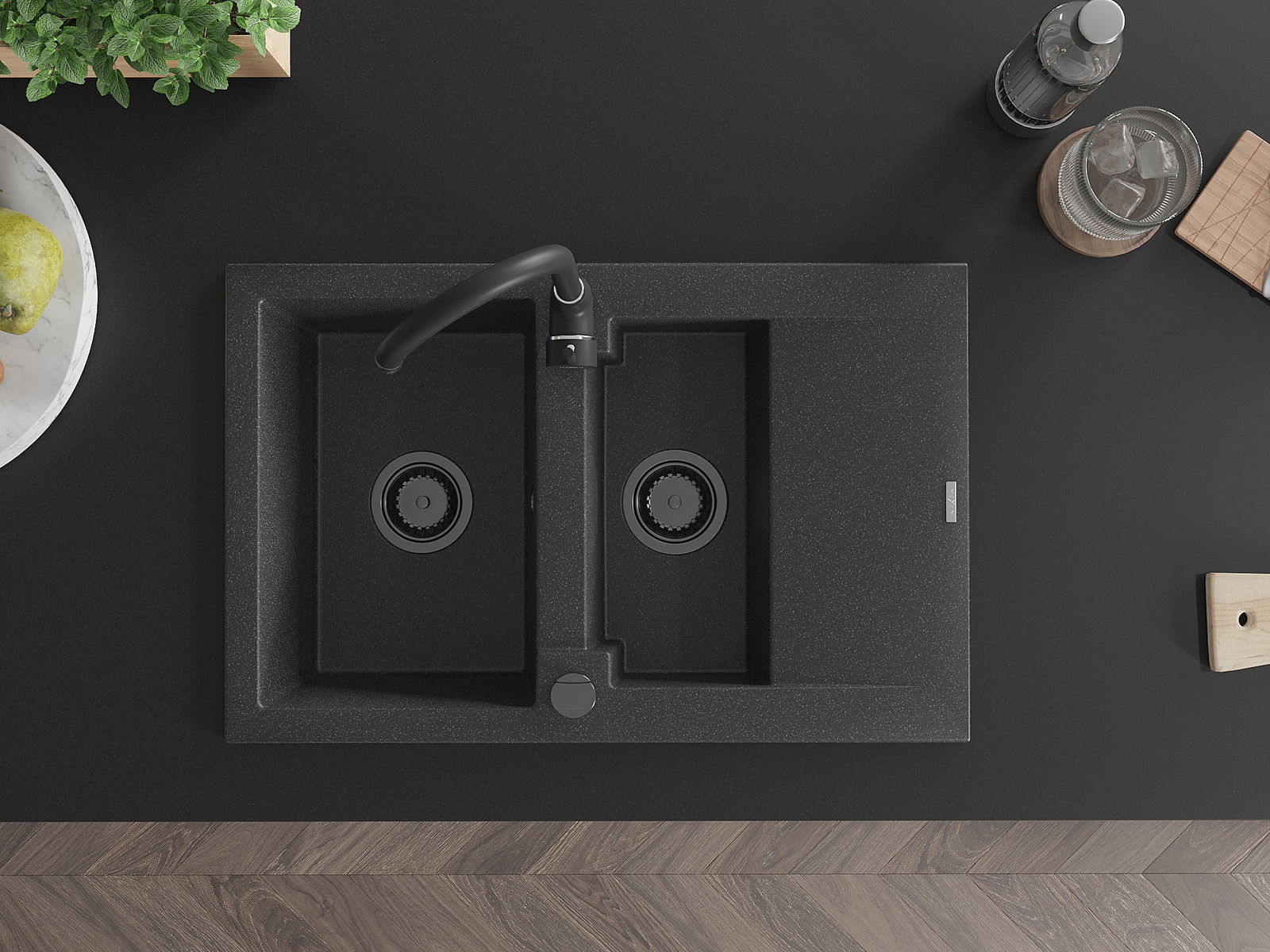 Mexen Gaspar granitový dřez 1,5-komorový s odkapem a kuchyňskou baterií Telma, černý s tečkami - 6507-76-670200-70-B