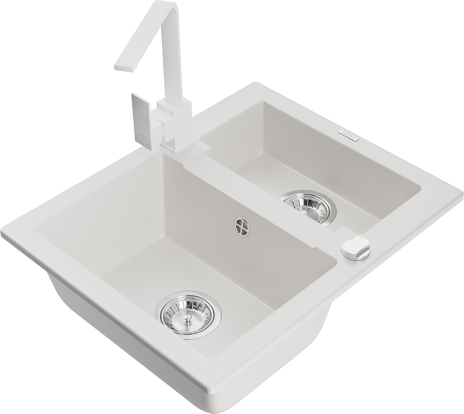 Mexen Carlos žulový dřez 1,5 komorový s kuchyňskou baterií Rita, bílý - 6518-20-670300-20