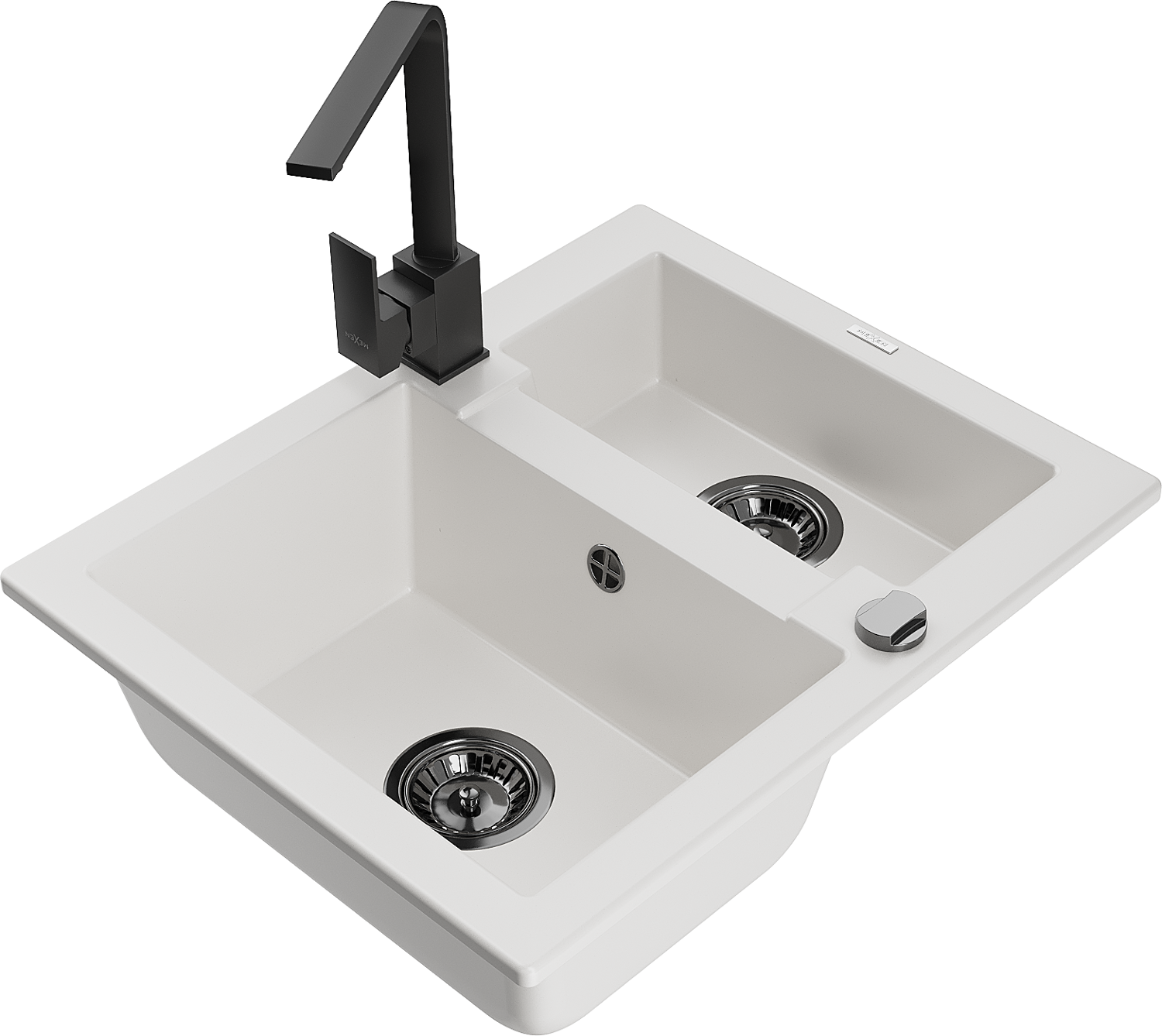 Mexen Carlos granitový dřez 1,5-komorový s kuchyňskou baterií Rita, bílý - 6518-20-670300-70