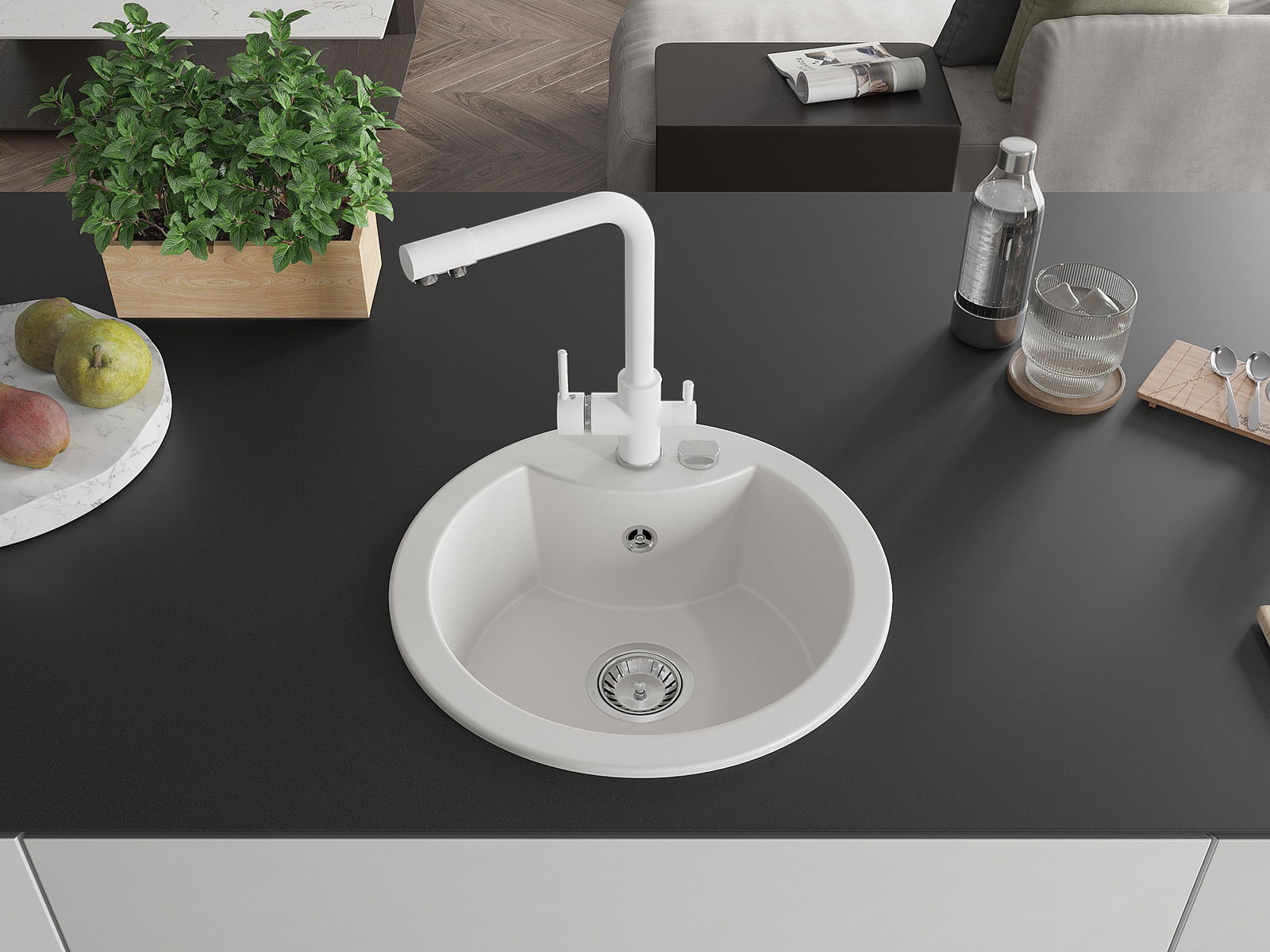 Povrch dřezu je odolný proti skvrnám a zabarvení, což usnadňuje jeho čištění a zachovává jeho barvu po dlouhou dobu používání. Estetický a praktický doplněk každé kuchyně.