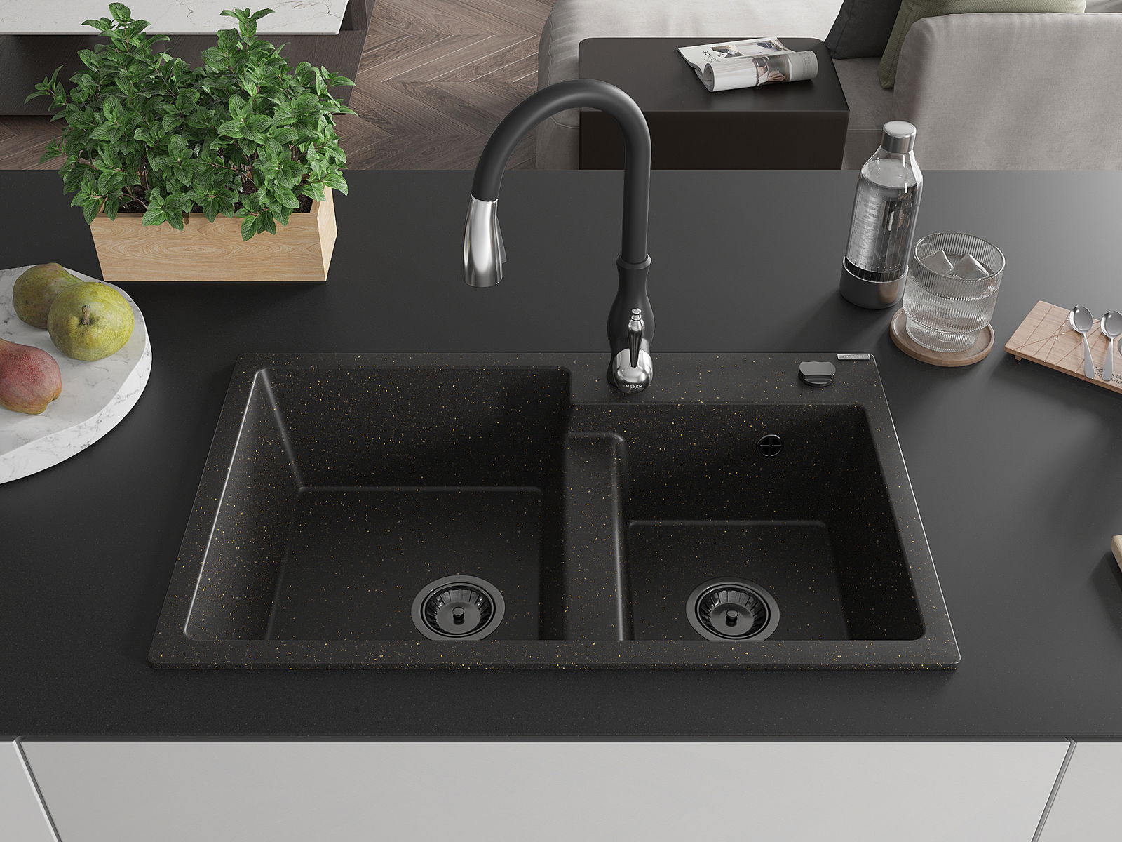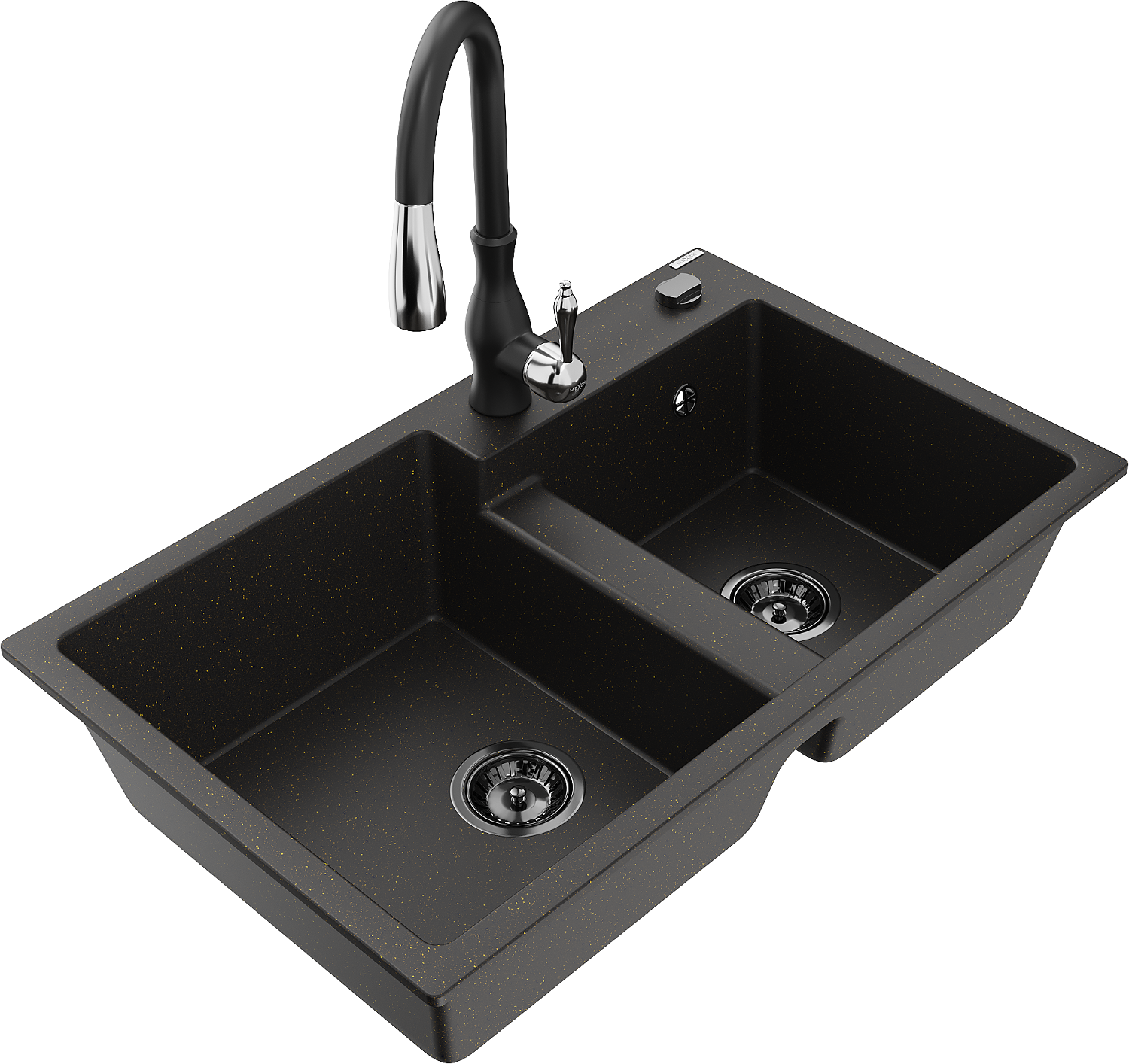 Mexen Tomas granitový dřez dvoukomorový s kuchyňskou baterií Savita, černý/zlatý metalik - 6516-75-672601-70-B