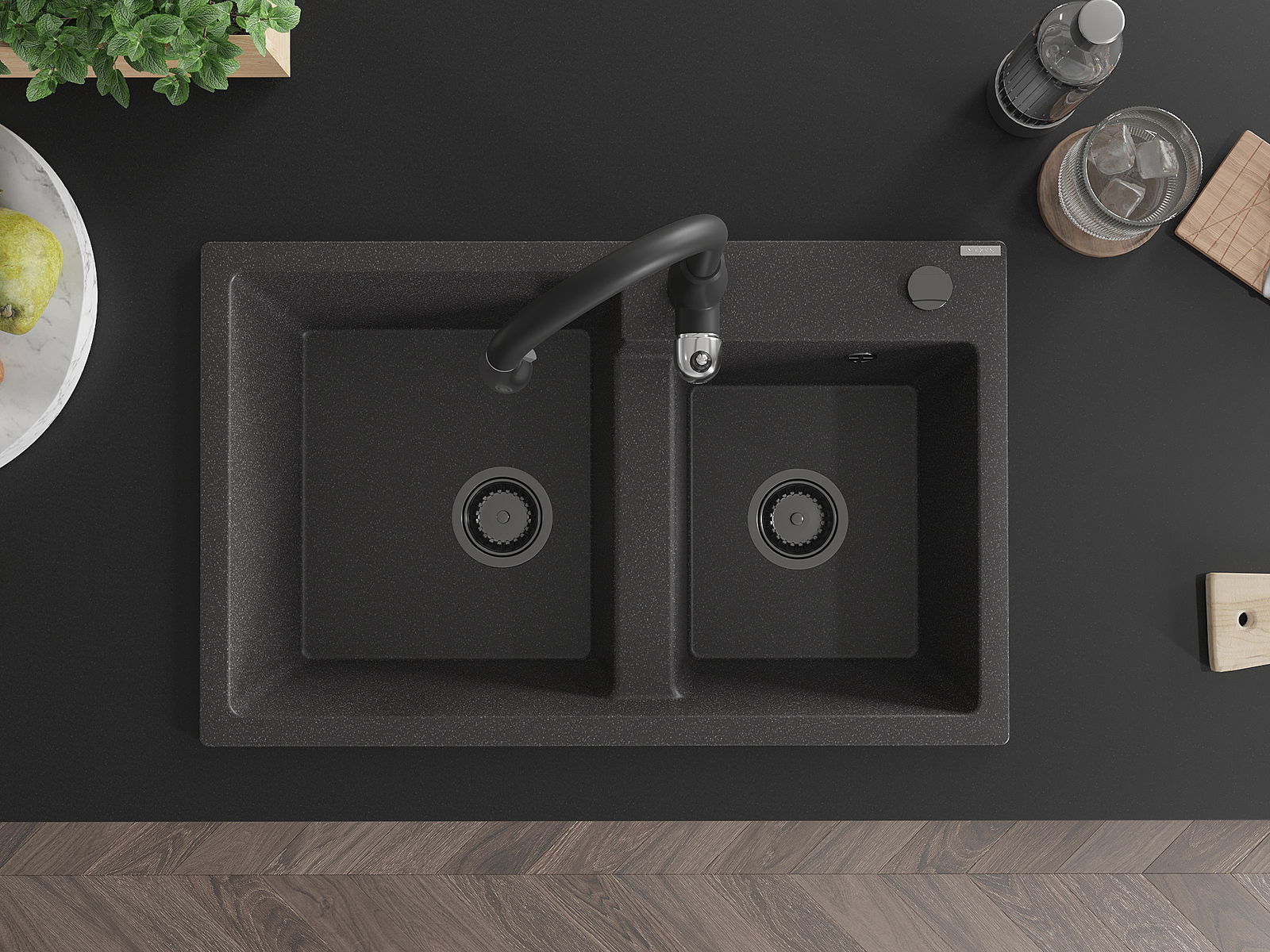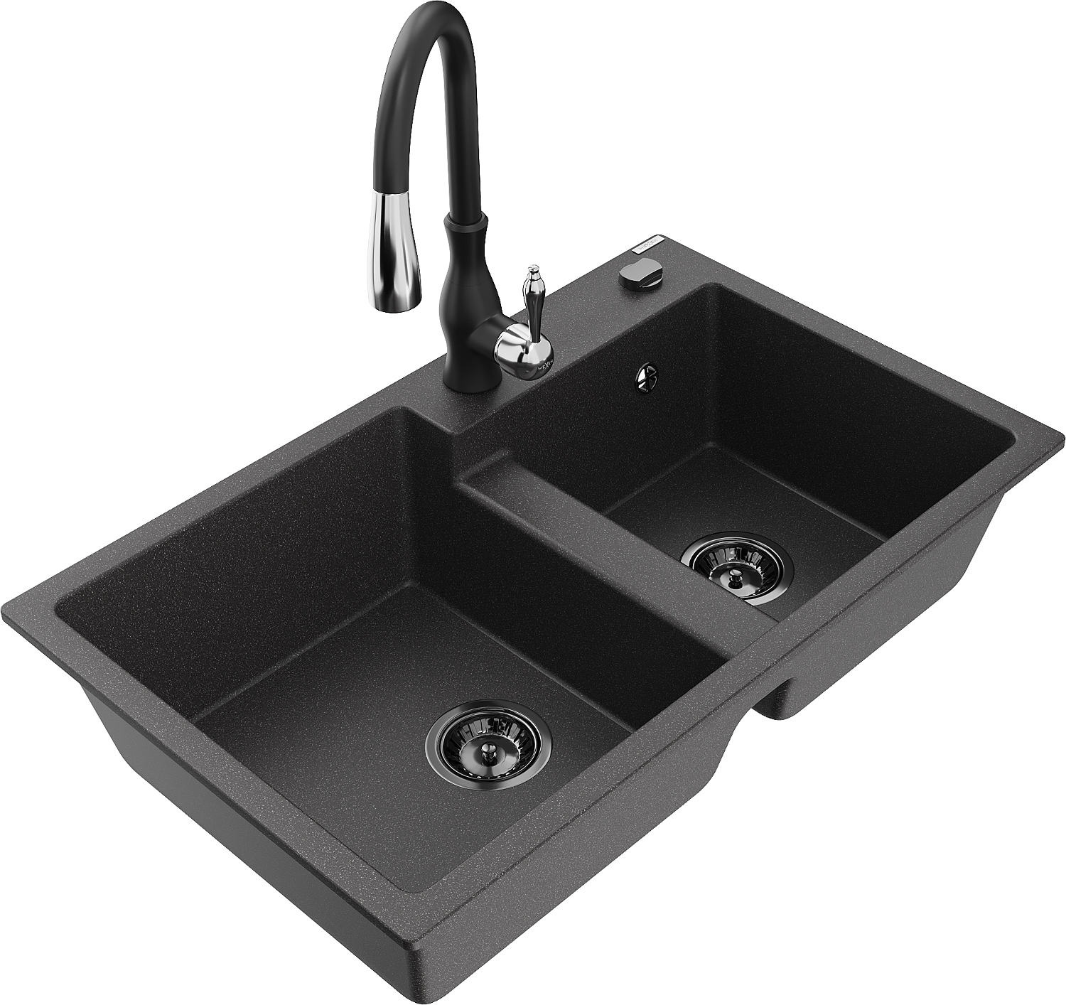 Mexen Tomas žulový dřez 2komorový s kuchyňskou baterií Savita, černý s tečkami - 6516-76-672601-70-B