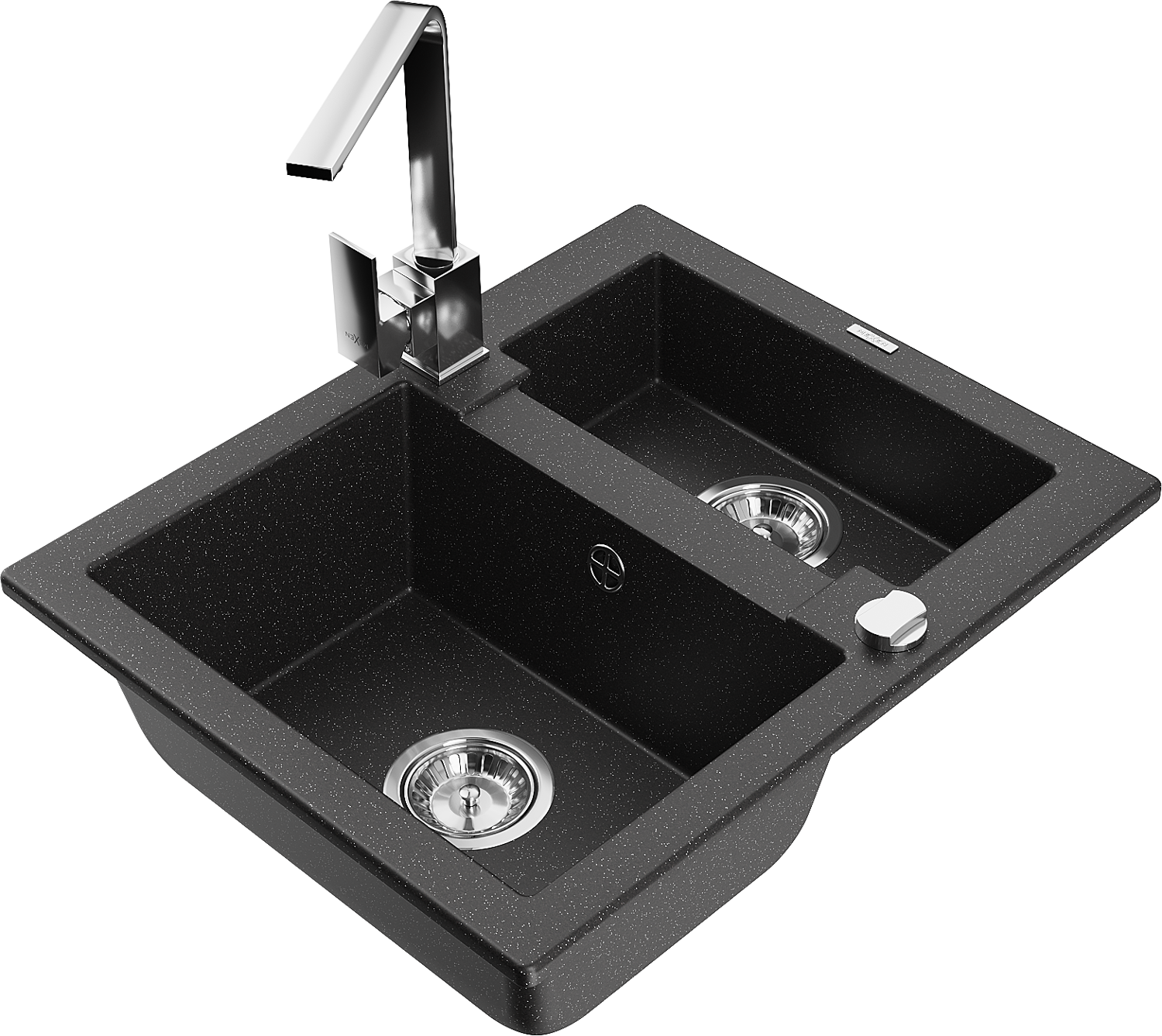 Mexen Carlos granitový dřez 1,5-komorový s kuchyňskou baterií Rita, černý/stříbrný metalik - 6518-73-670300-00