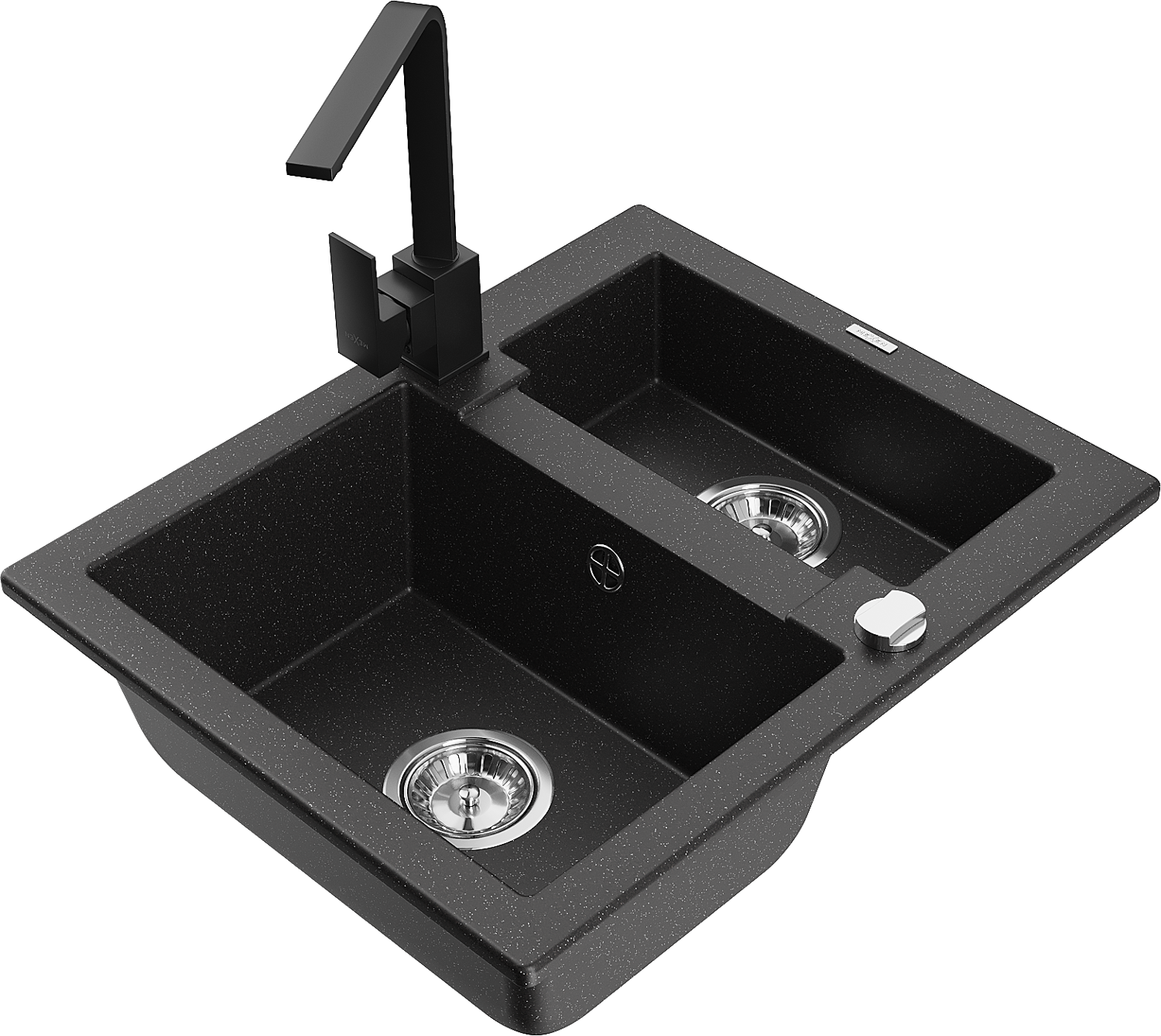 Mexen Carlos dřez granitový 1,5-komorový s kuchyňskou baterií Rita, černý/stříbrný metalik - 6518-73-670300-70