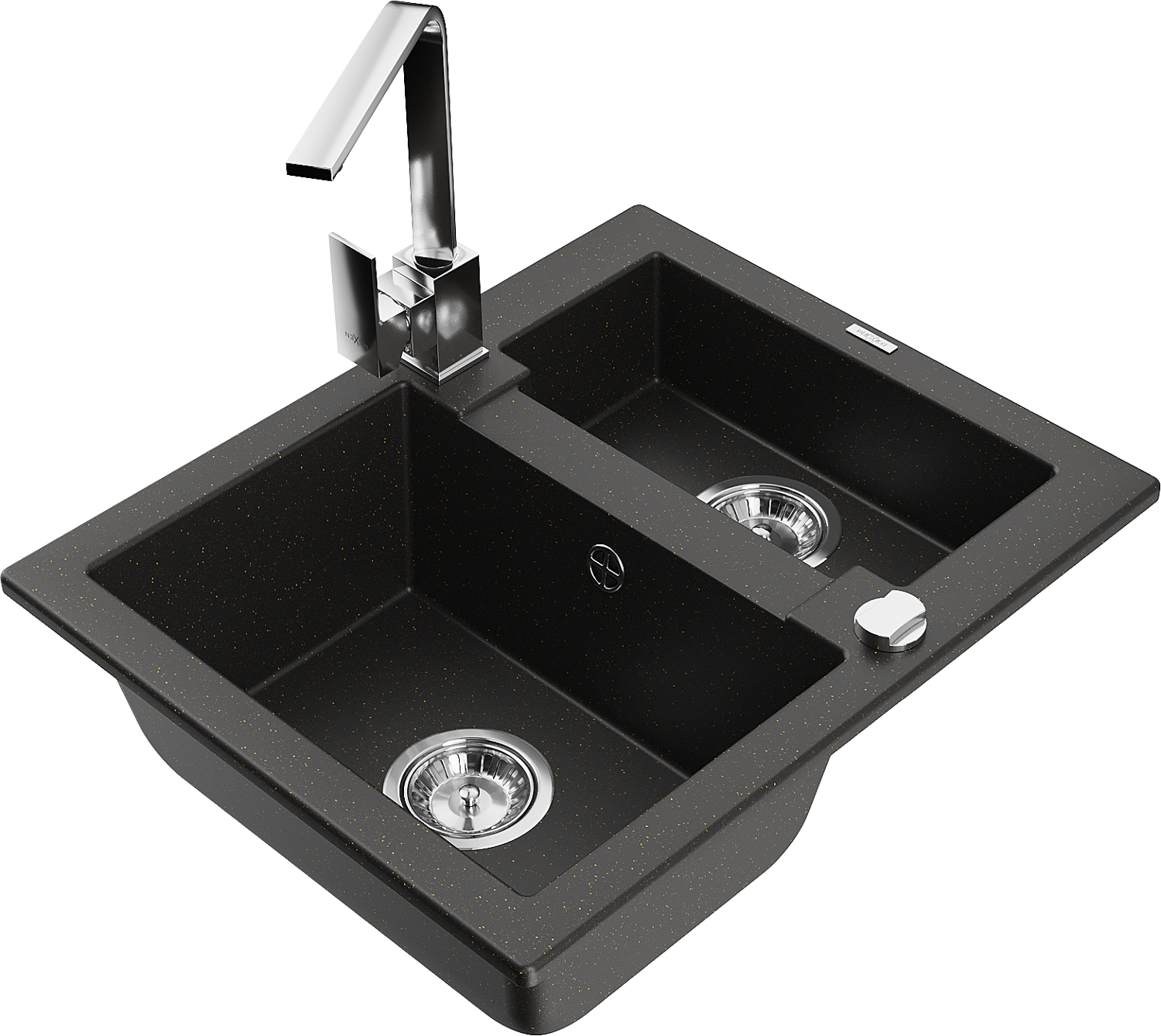 Mexen Carlos granitový dřez 1,5-komorový s kuchyňskou baterií Rita, černý/zlatý metalik - 6518-75-670300-00