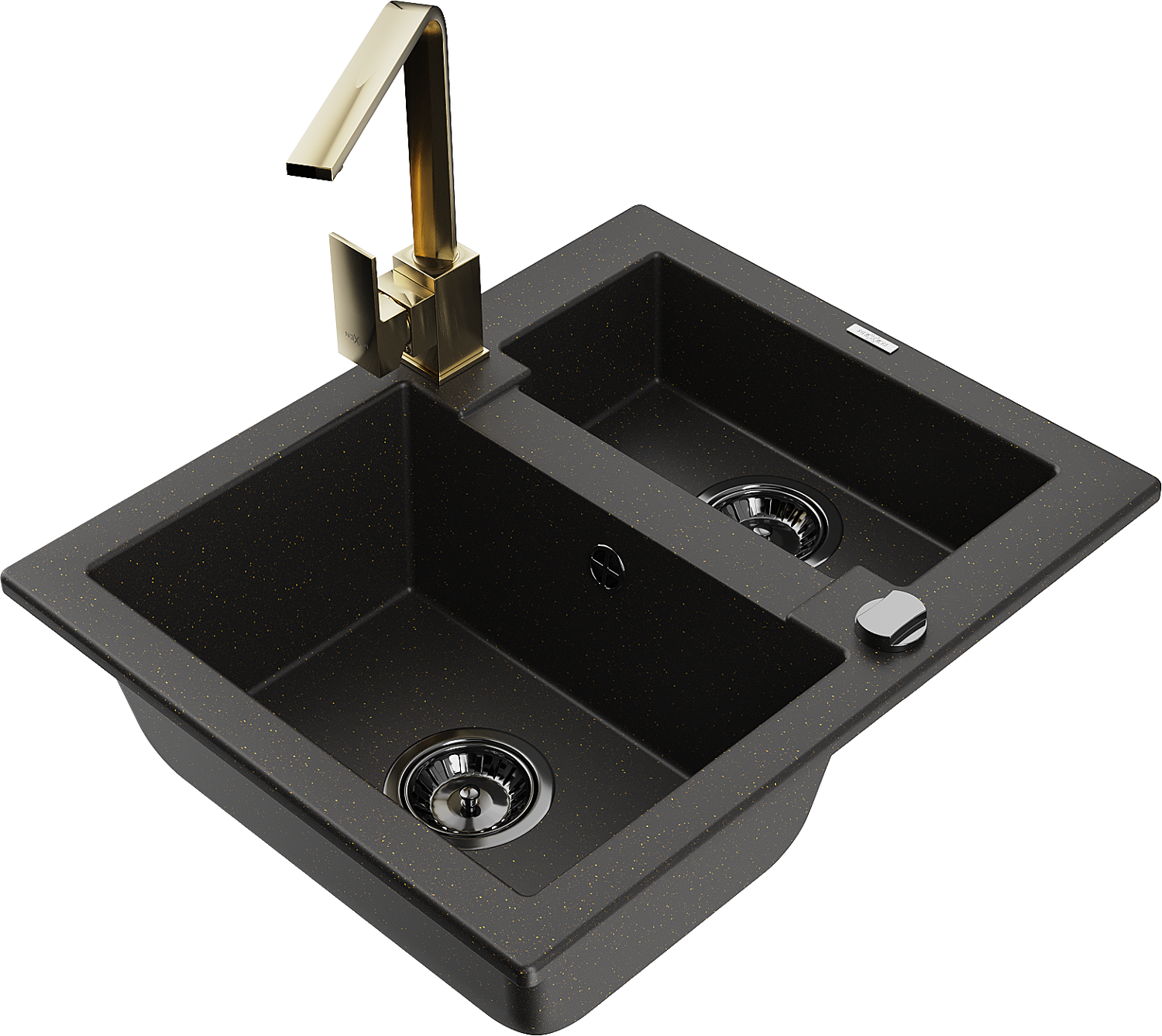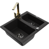 Mexen Carlos granitový dřez 1,5-komorový s kuchyňskou baterií Rita, černý/zlatý metalik - 6518-75-670300-50-B