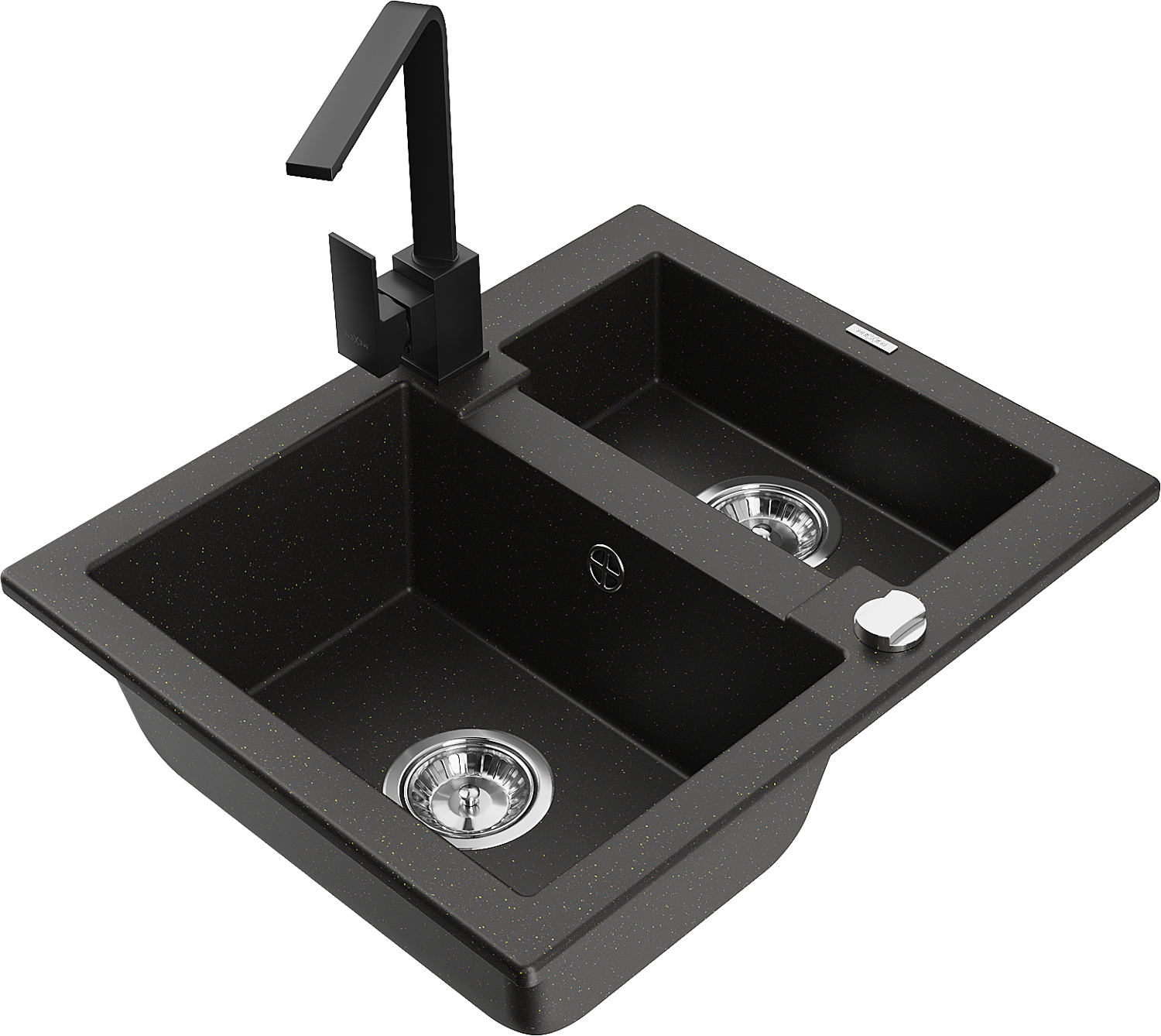 Mexen Carlos granitový dřez 1,5-komorový s kuchyňskou baterií Rita, černý/zlatý metalík - 6518-75-670300-70