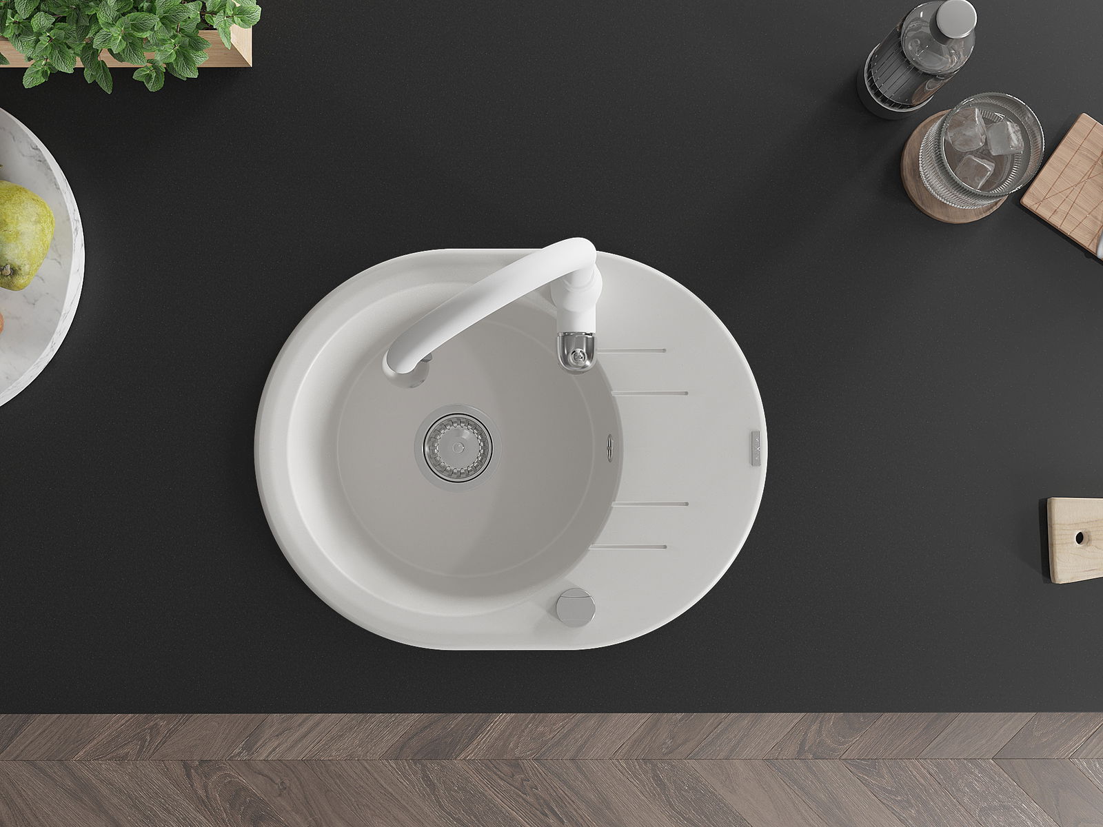 Povrch dřezu je odolný proti skvrnám a zabarvení, což usnadňuje jeho čištění a zachovává jeho barvu po dlouhou dobu používání. Estetický a praktický doplněk každé kuchyně.