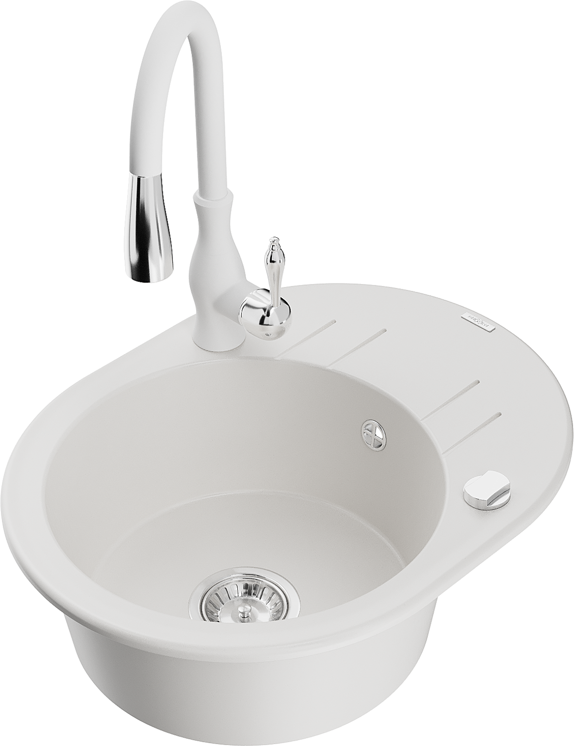 Mexen Kevin granitový dřez 1-komorový s odkapávačem a kuchyňskou baterií Savita, bílý - 6517-20-672601-20