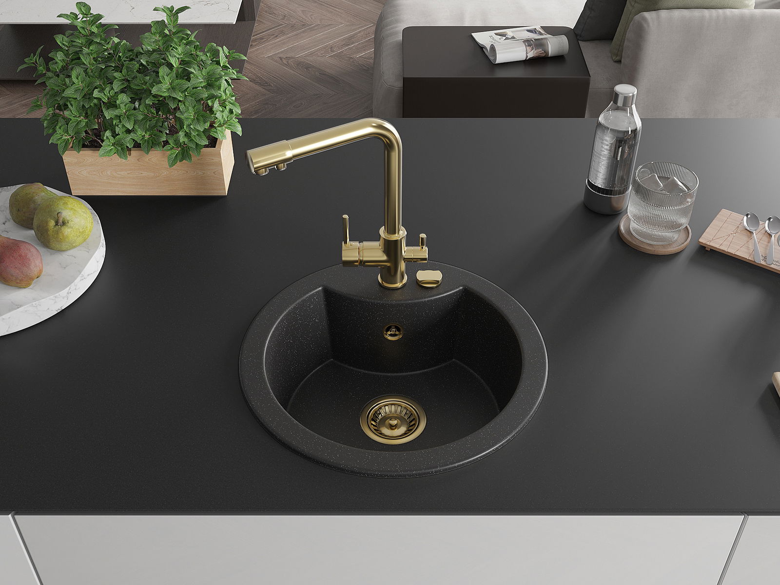 Mexen Diego jednokomorový žulový dřez s kuchyňskou baterií Duero, černý/stříbrný metalik - 6512-73-671600-50