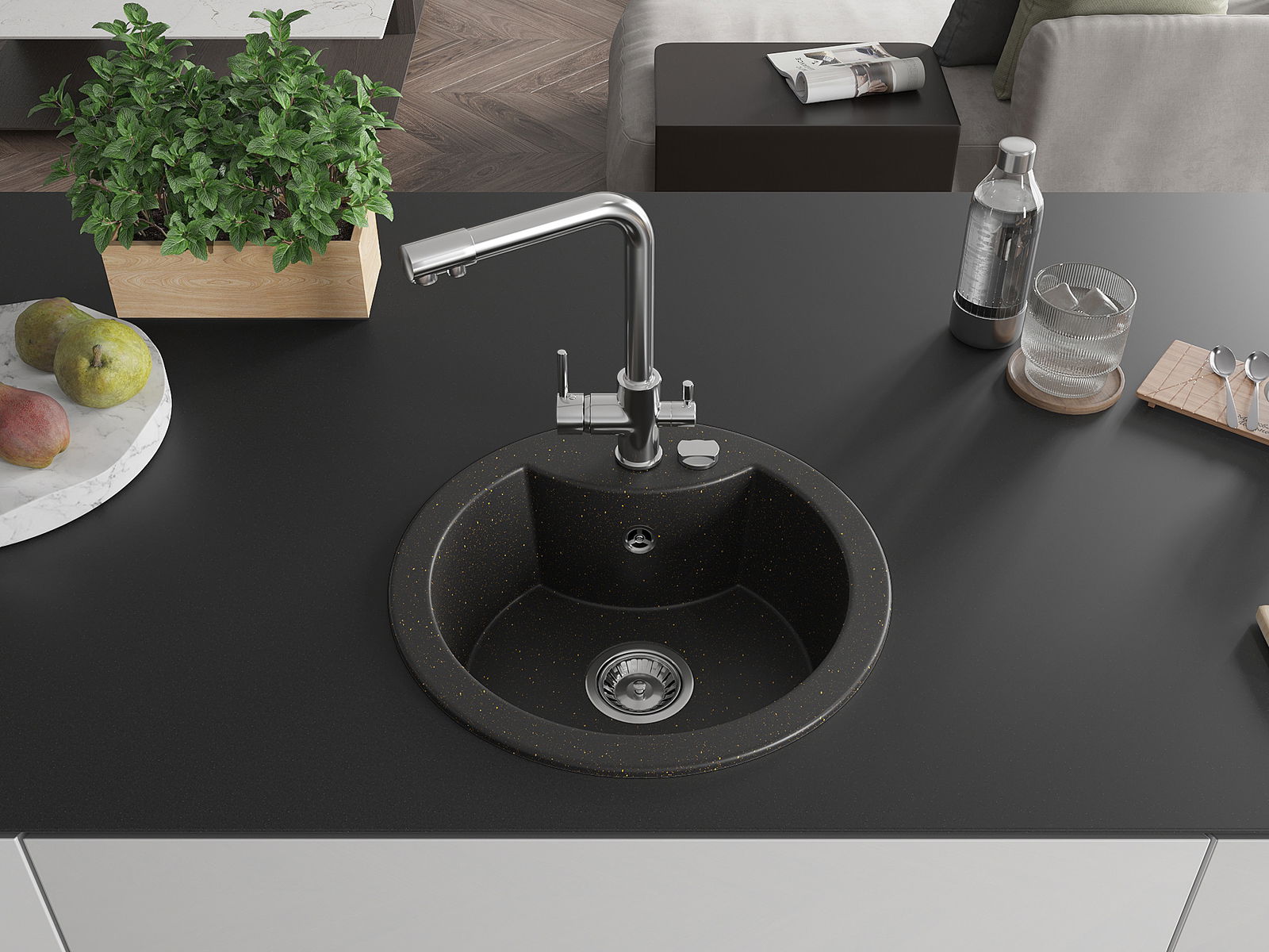 Dřez má předfrézovaný otvor o průměru 35 mm k samostatnému proražení. Může být použit například k montáži dávkovače na tekutinu, který eliminuje přítomnost plastových lahví v kuchyni a dodá jí elegantní finiš.