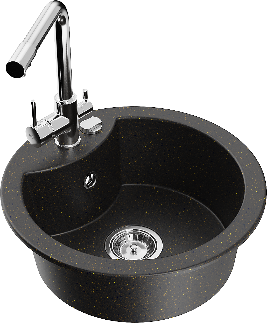 Mexen Diego granitový dřez 1-komorový s kuchyňskou baterií Duero, černý/zlatý metalický - 6512-75-671600-00