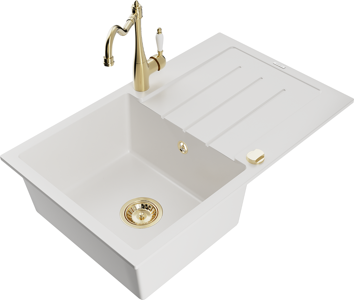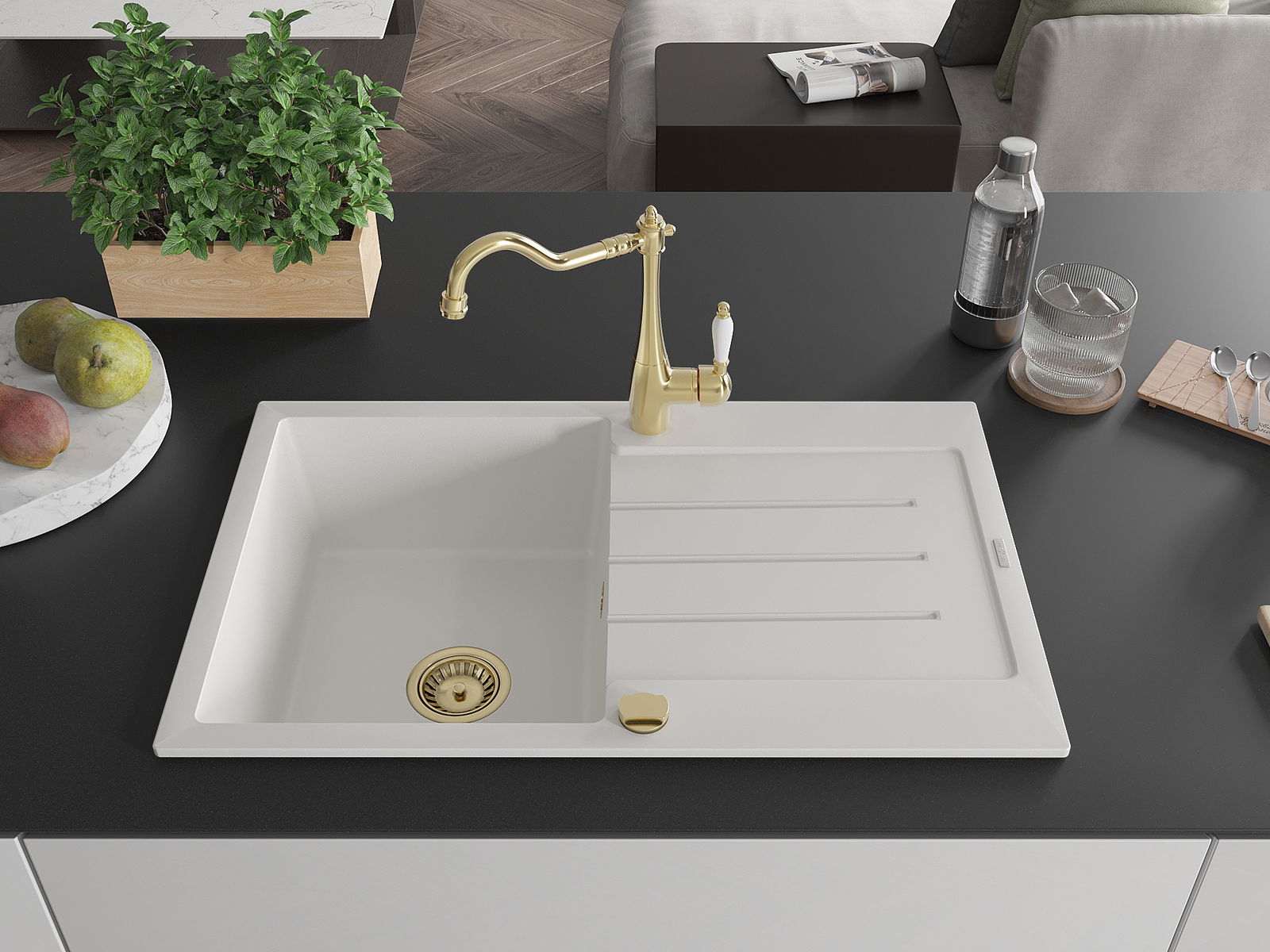 Mexen Bruno granitový dřez 1-komorový s odkapávačem a kuchyňskou baterií Carla, bílý - 6513-20-670700-50