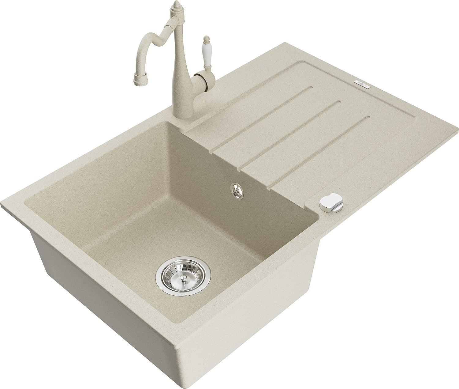 Mexen Bruno granitový dřez 1-komorový s odkapávačem a kuchyňskou baterií Carla, béžový - 6513-69-670700-69