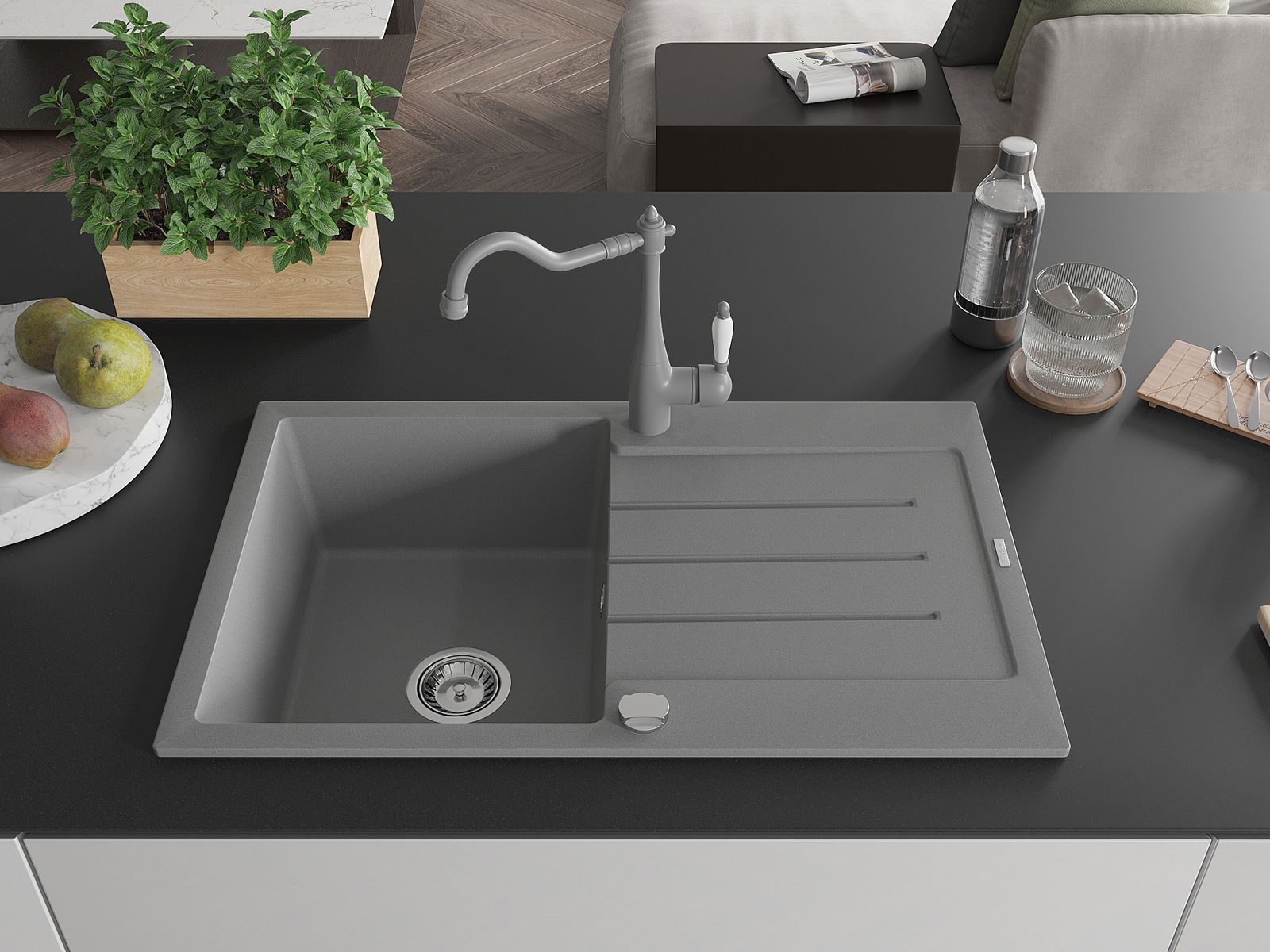 Mexen Bruno dřez žulový 1-komorový s odkapávačem a kuchyňskou baterií Carla, šedý - 6513-71-670700-71