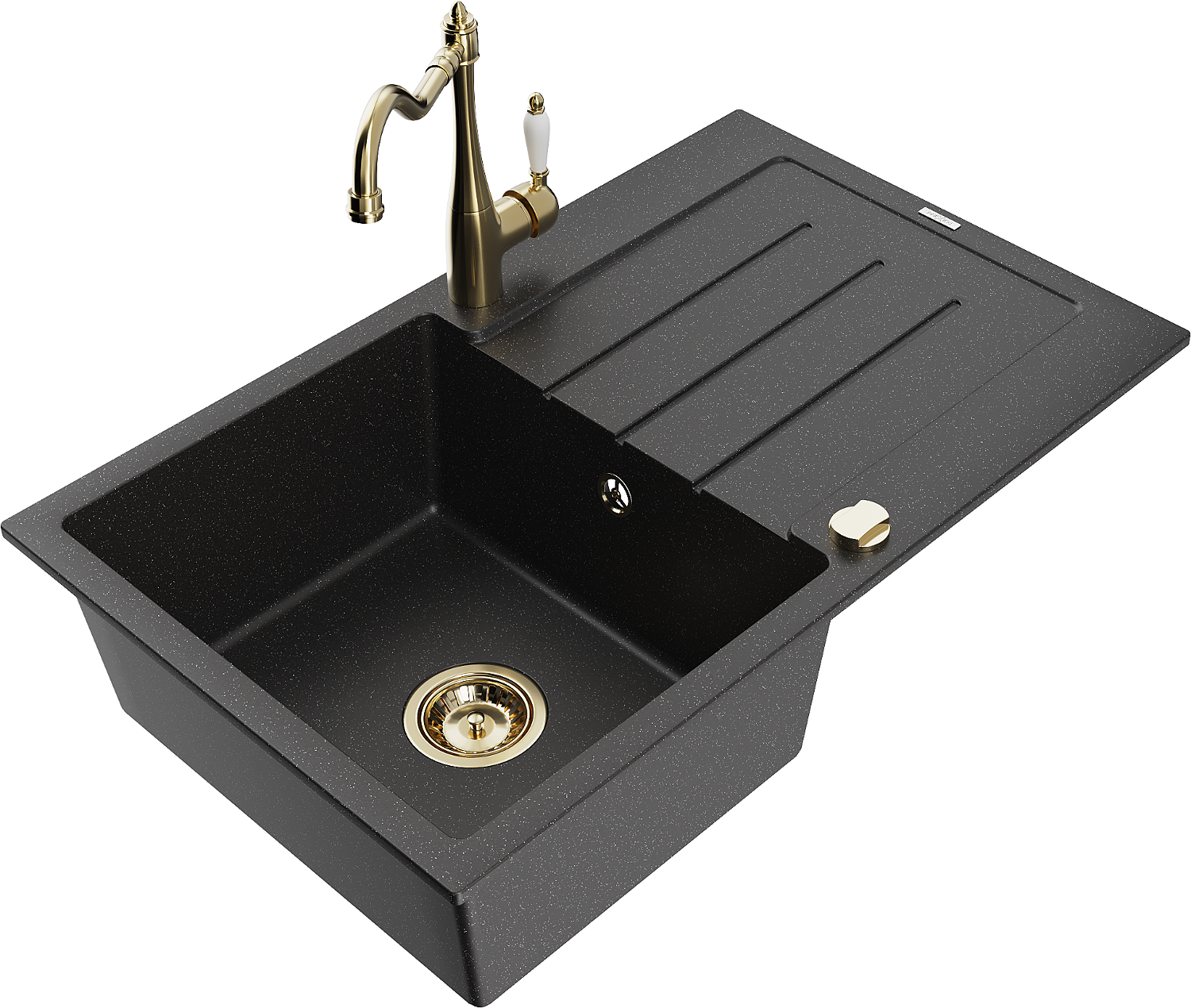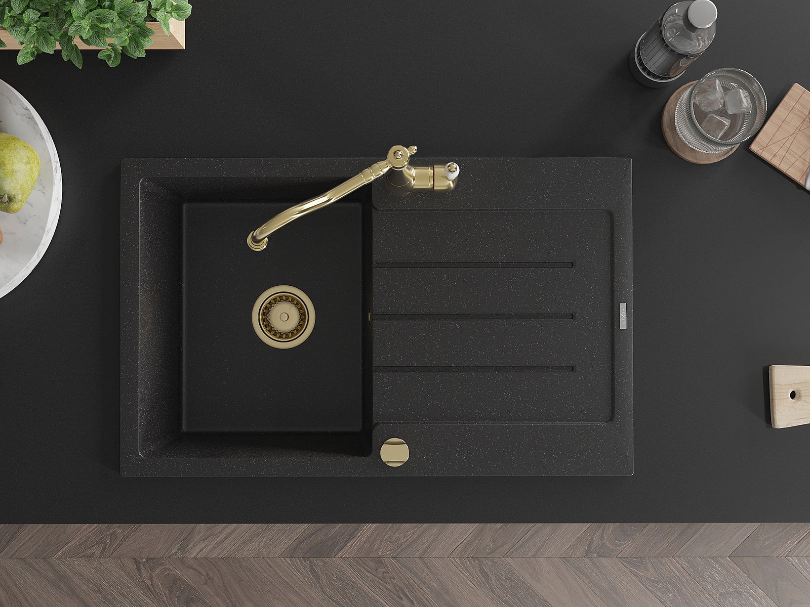 Mexen Bruno žulový dřez s jednou komorou s odkapávačem a kuchyňskou baterií Carla, černý/stříbrný metalíza - 6513-73-670700-50