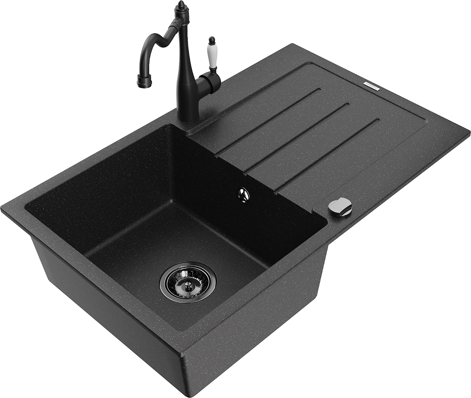 Mexen Bruno žulový dřez 1-komorový s odkapávačem a kuchyňskou baterií Carla, černý/stříbrný metalík - 6513-73-670700-70-B