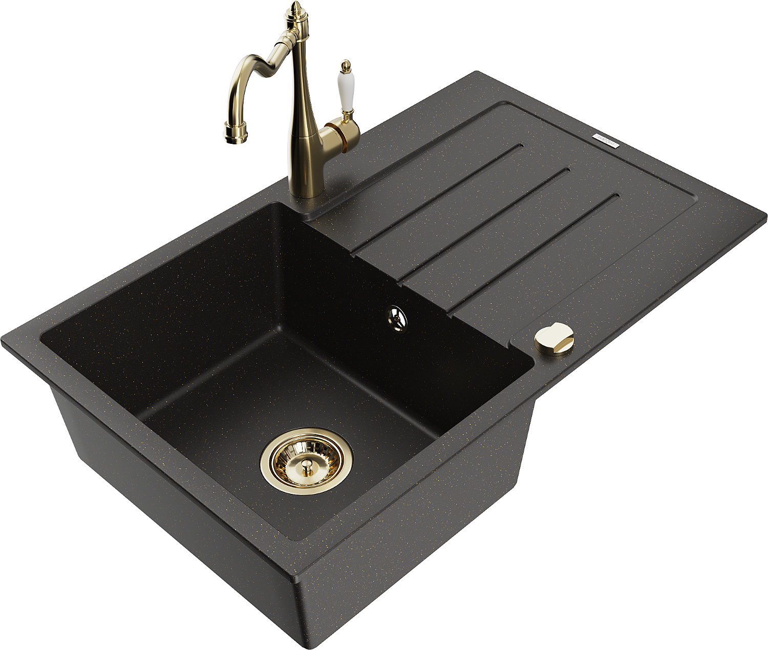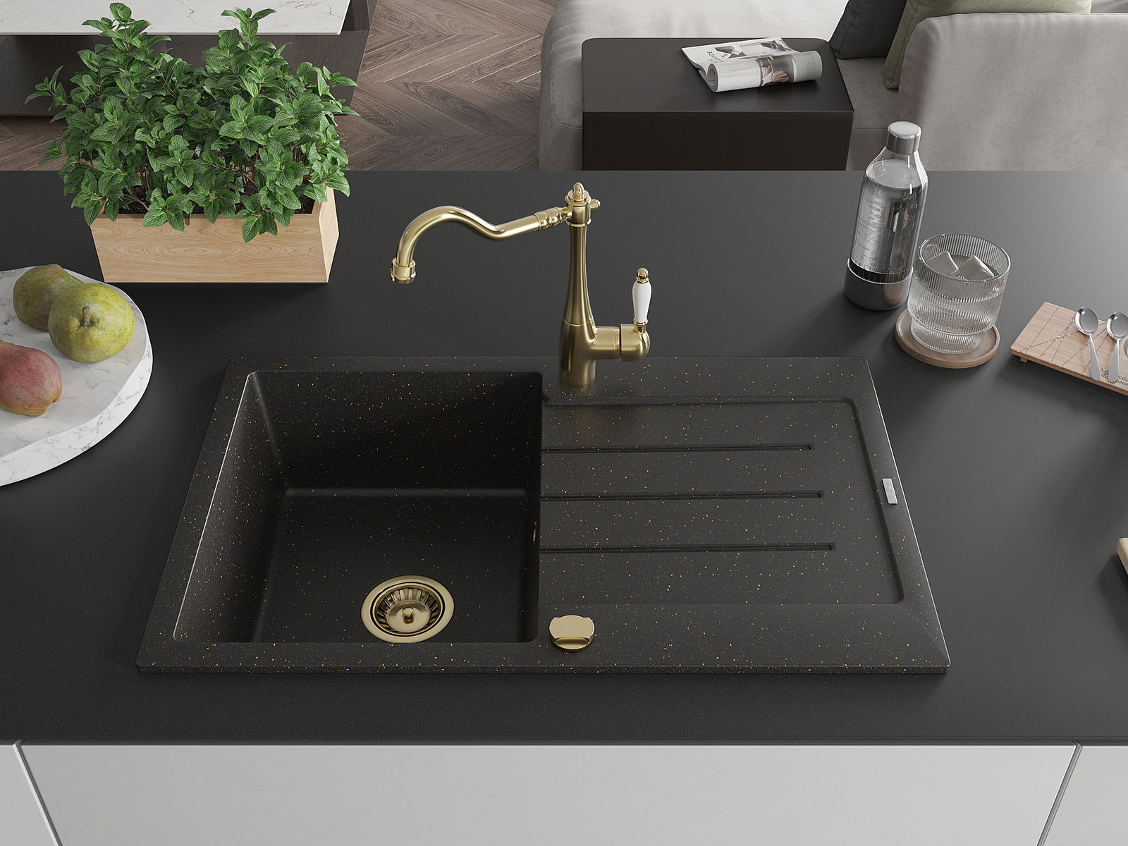 Mexen Bruno žulový dřez 1-komorový s odkapávačem a kuchyňskou baterií Carla, černý/zlatý metalik - 6513-75-670700-50
