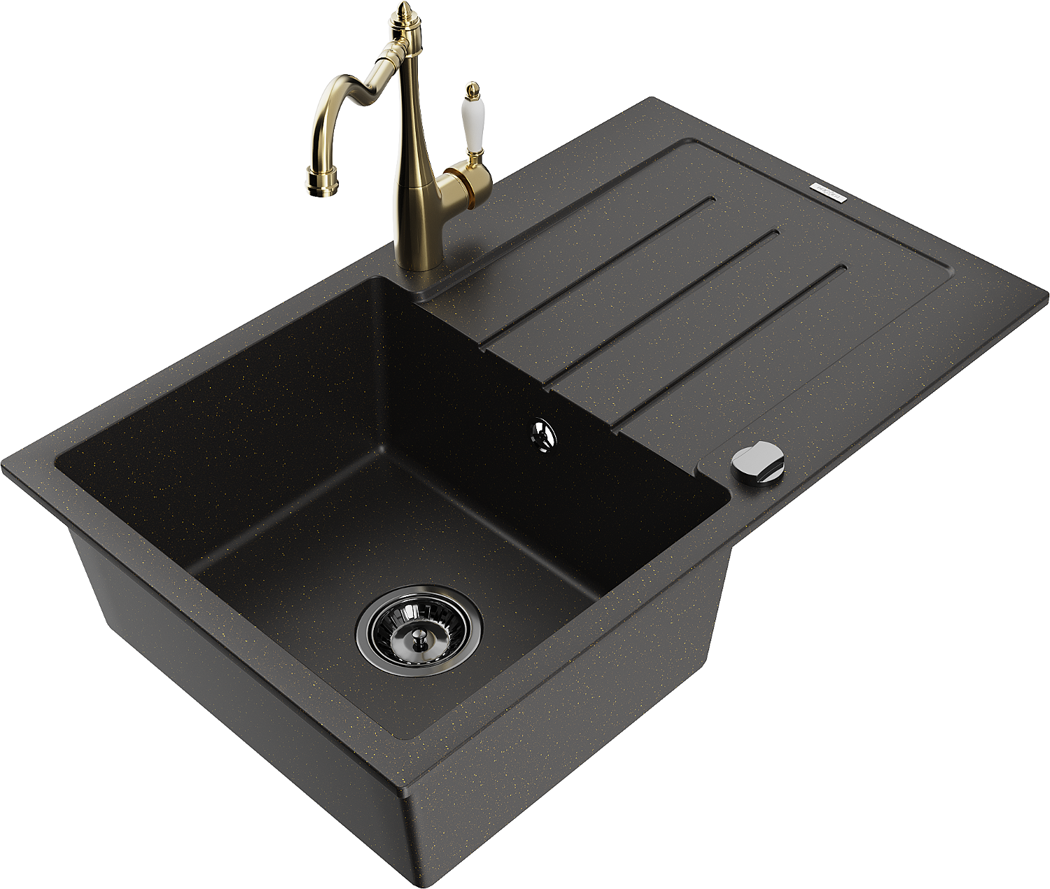 Mexen Bruno granitový dřez s 1 komorou a odkapávačem a kuchyňskou baterií Carla, černý/zlatý metalik - 6513-75-670700-50-B