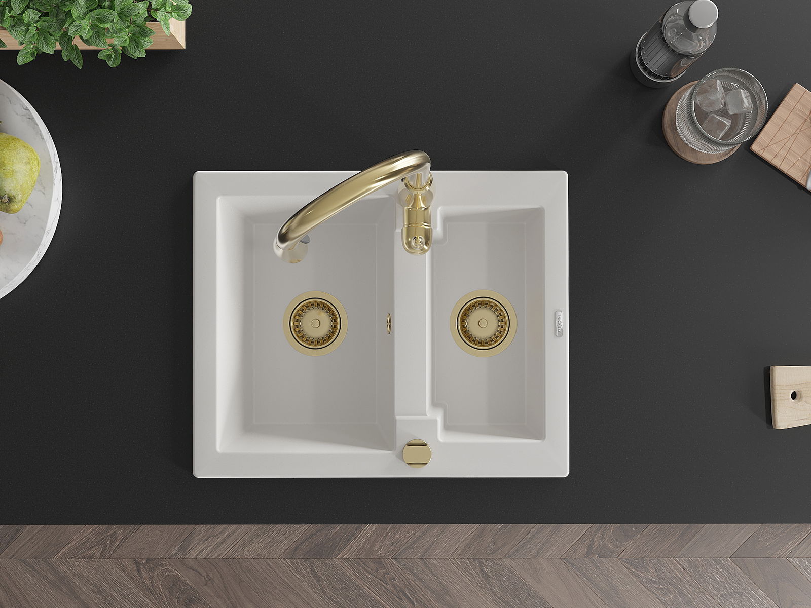 Mexen Carlos granitový dřez 1,5-komorový s kuchyňskou baterií Savita, bílý - 6518-20-672601-50