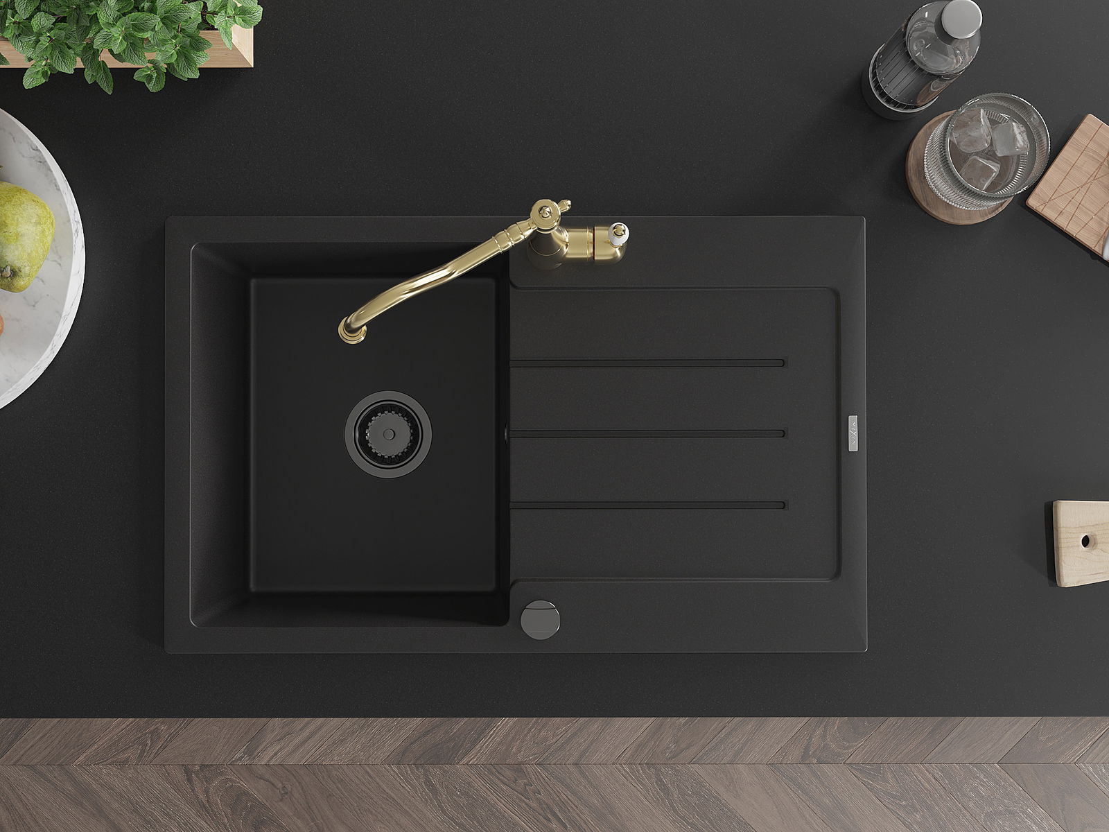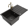 Mexen Bruno granitový dřez s jednou komorou a odkapávačem a kuchyňskou baterií Carla, černý - 6513-77-670700-50-B