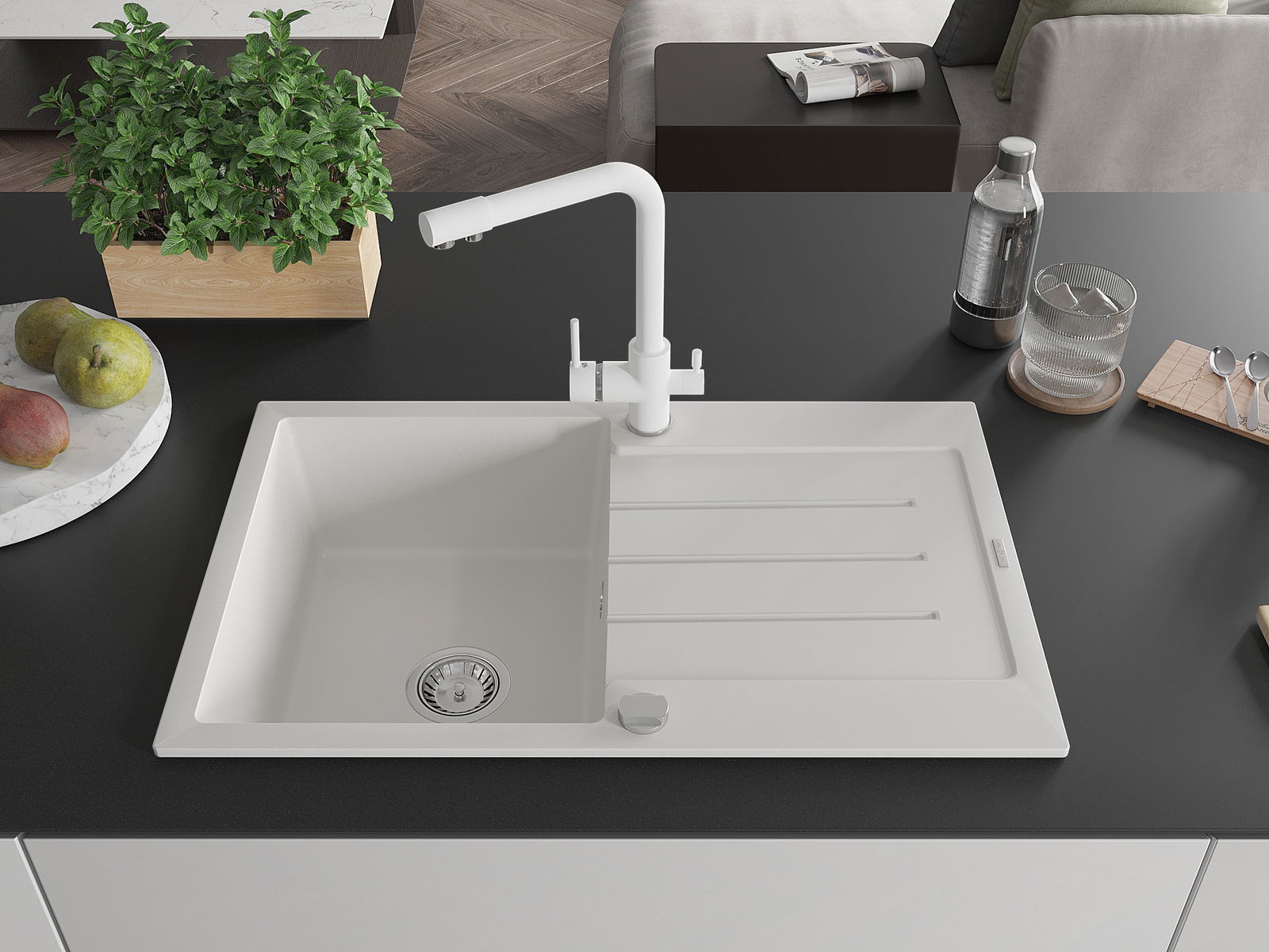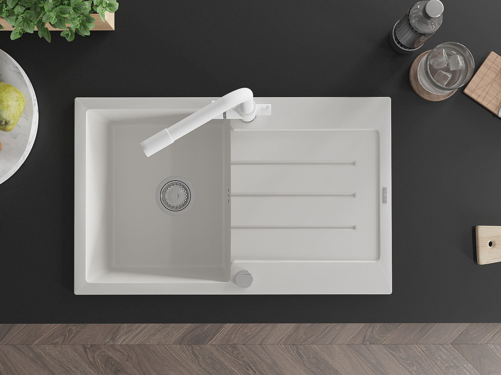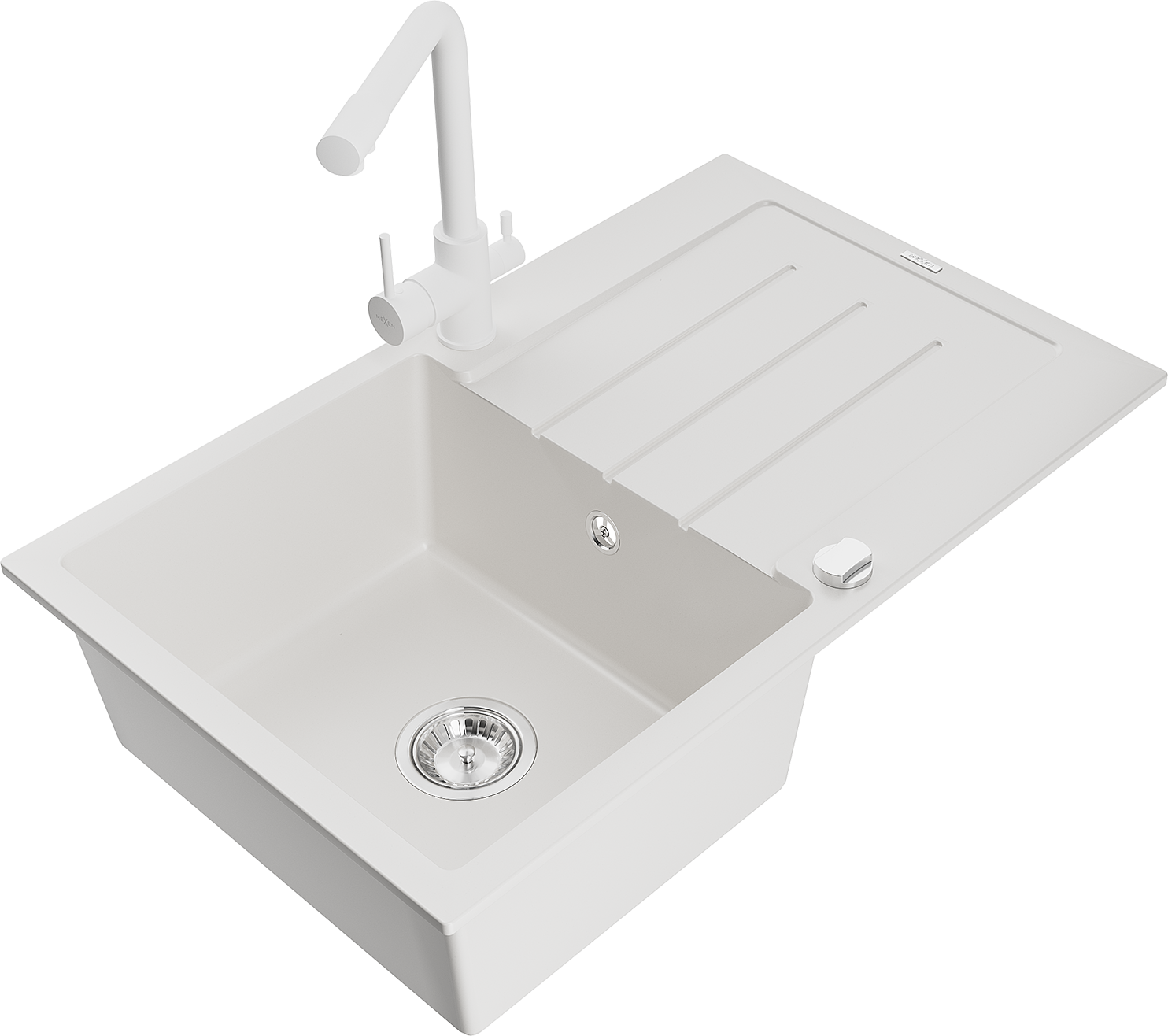• Mexen Bruno granitový dřez 1-komorový s odkapávačem a kuchyňskou baterií Duero, bílý - 6513-20-671600-20