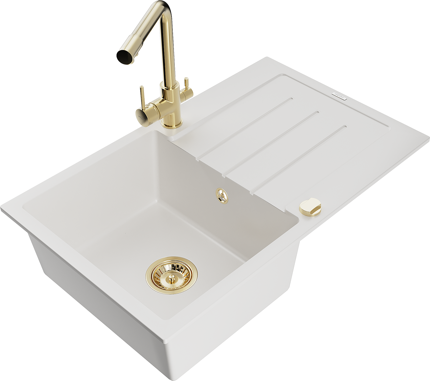 Mexen Bruno jednodřezový granitový dřez s odkapávačem a kuchyňskou baterií Duero, bílý - 6513-20-671600-50