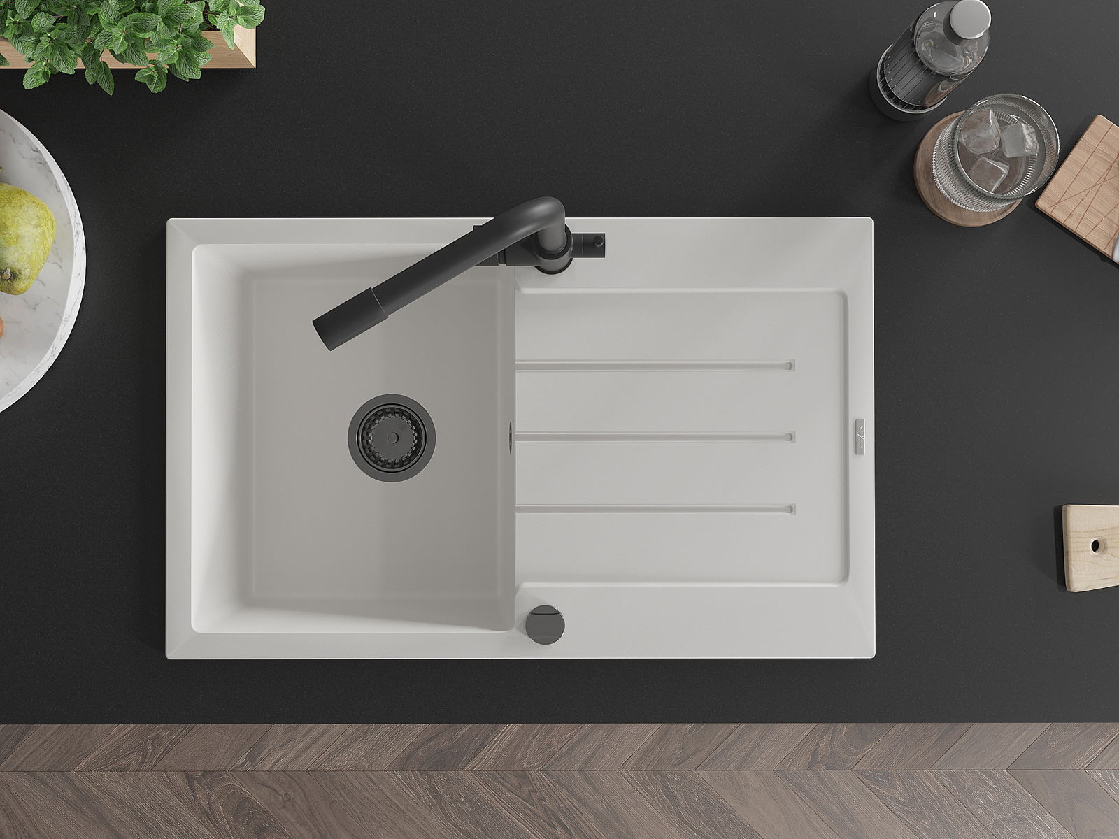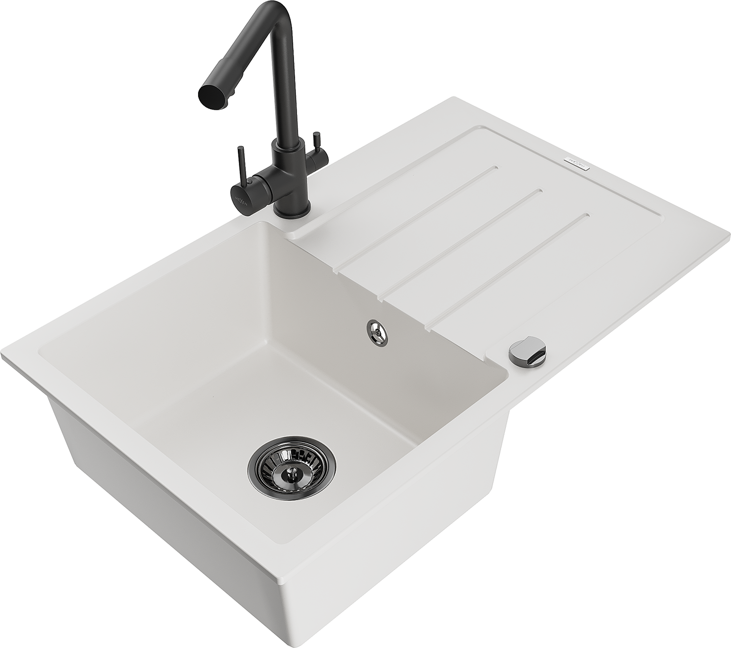 Mexen Bruno kuchyňský dřez granitový 1-komorový s odkapávačem a kuchyňskou baterií Duero, bílý - 6513-20-671600-70