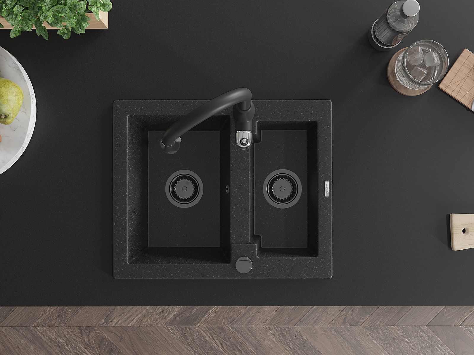 Mexen Carlos dřez z granitu 1,5-komorový s kuchyňskou baterií Savita, černý/stříbrný metalik - 6518-73-672601-70-B
