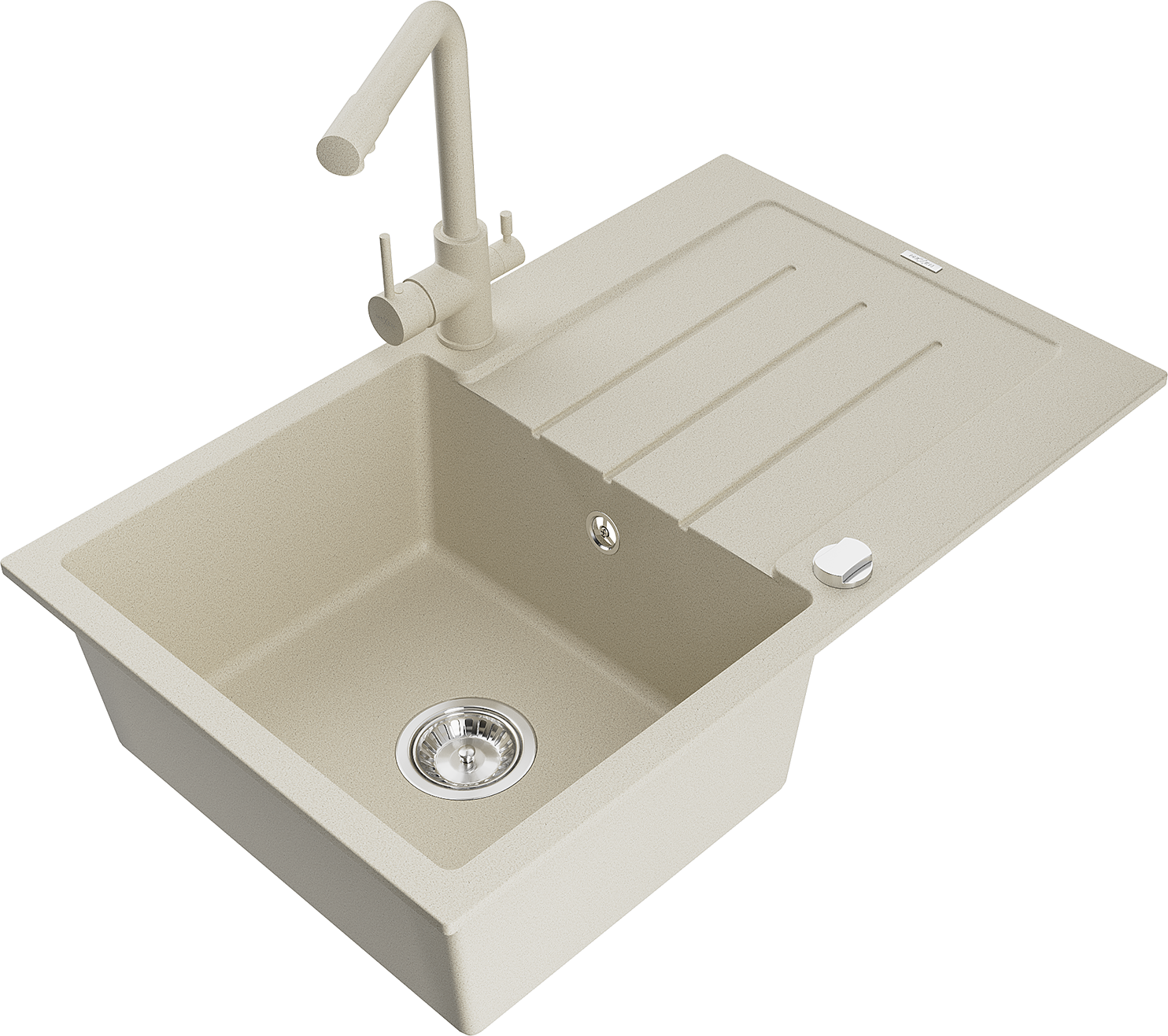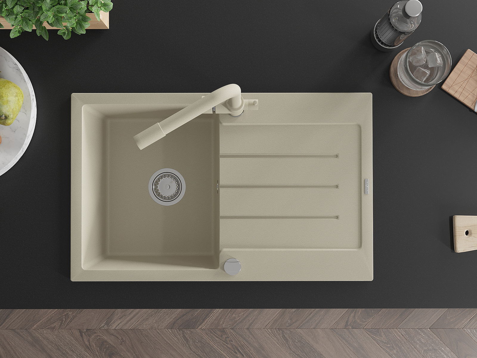 Mexen Bruno granitový dřez s jednou komorou a odkapávačem a kuchyňskou baterií Duero, béžový - 6513-69-671600-69