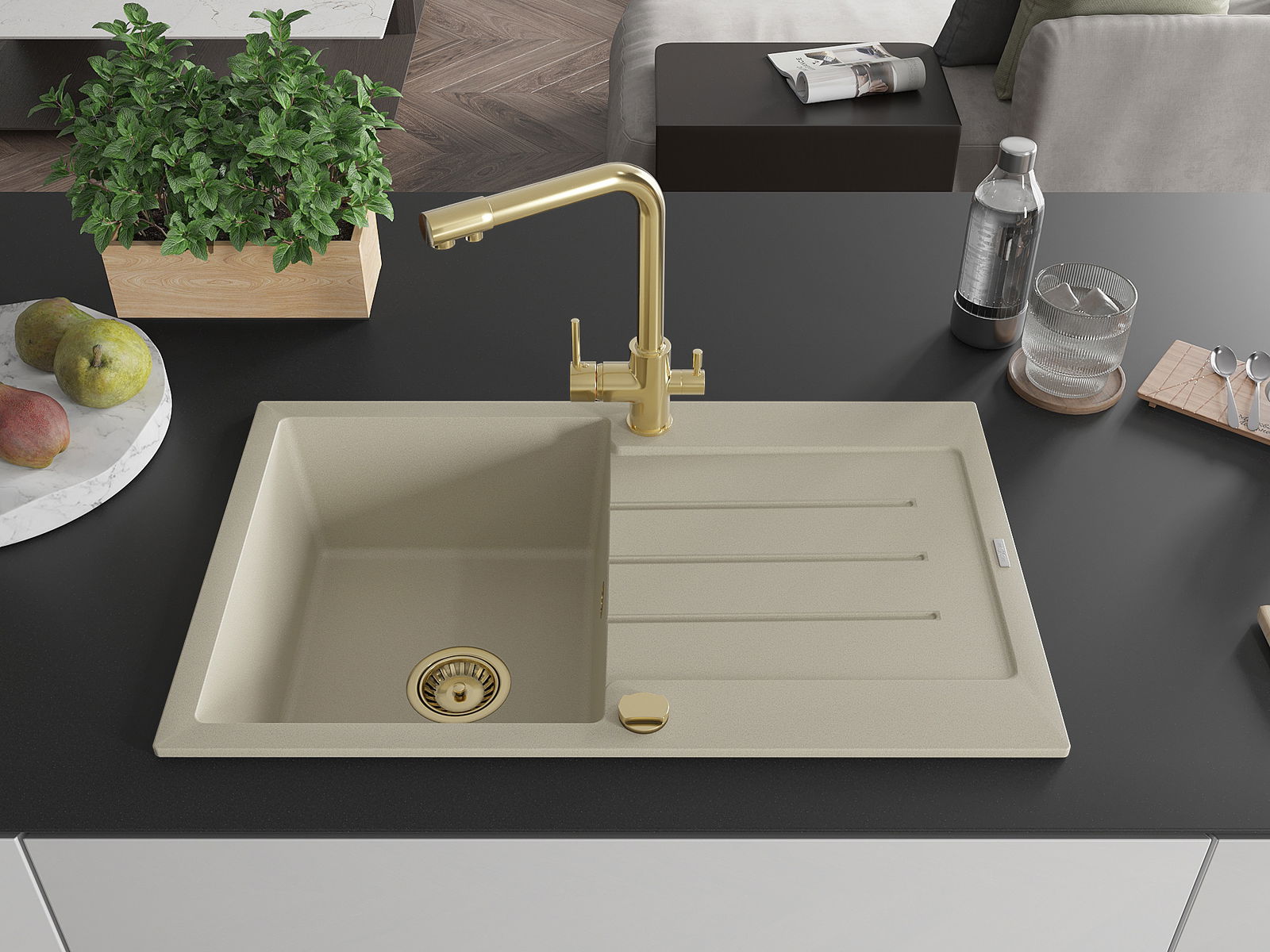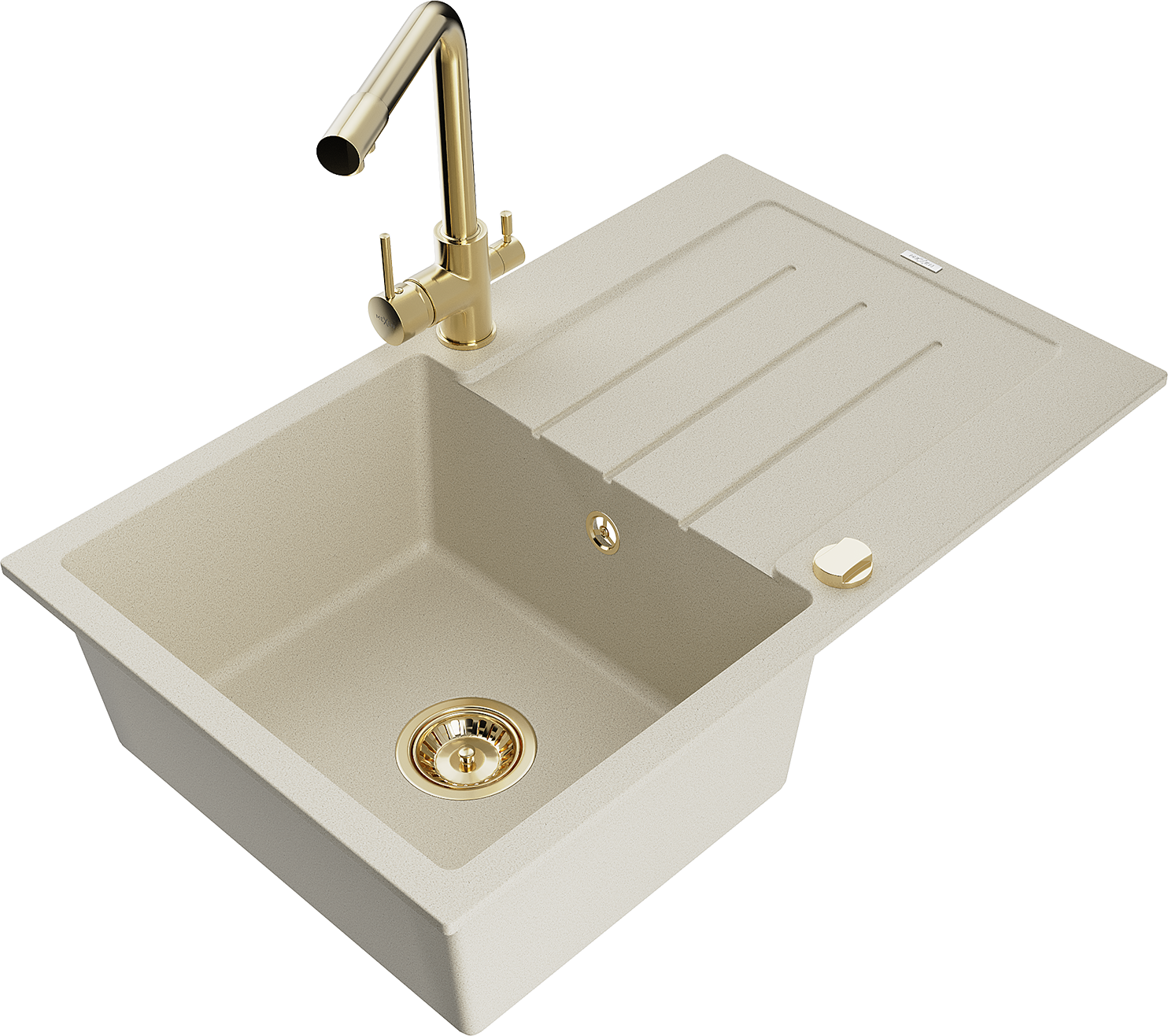 Mexen Bruno granitový dřez 1-komorový s odkapávačem a kuchyňskou baterií Duero, béžový - 6513-69-671600-50