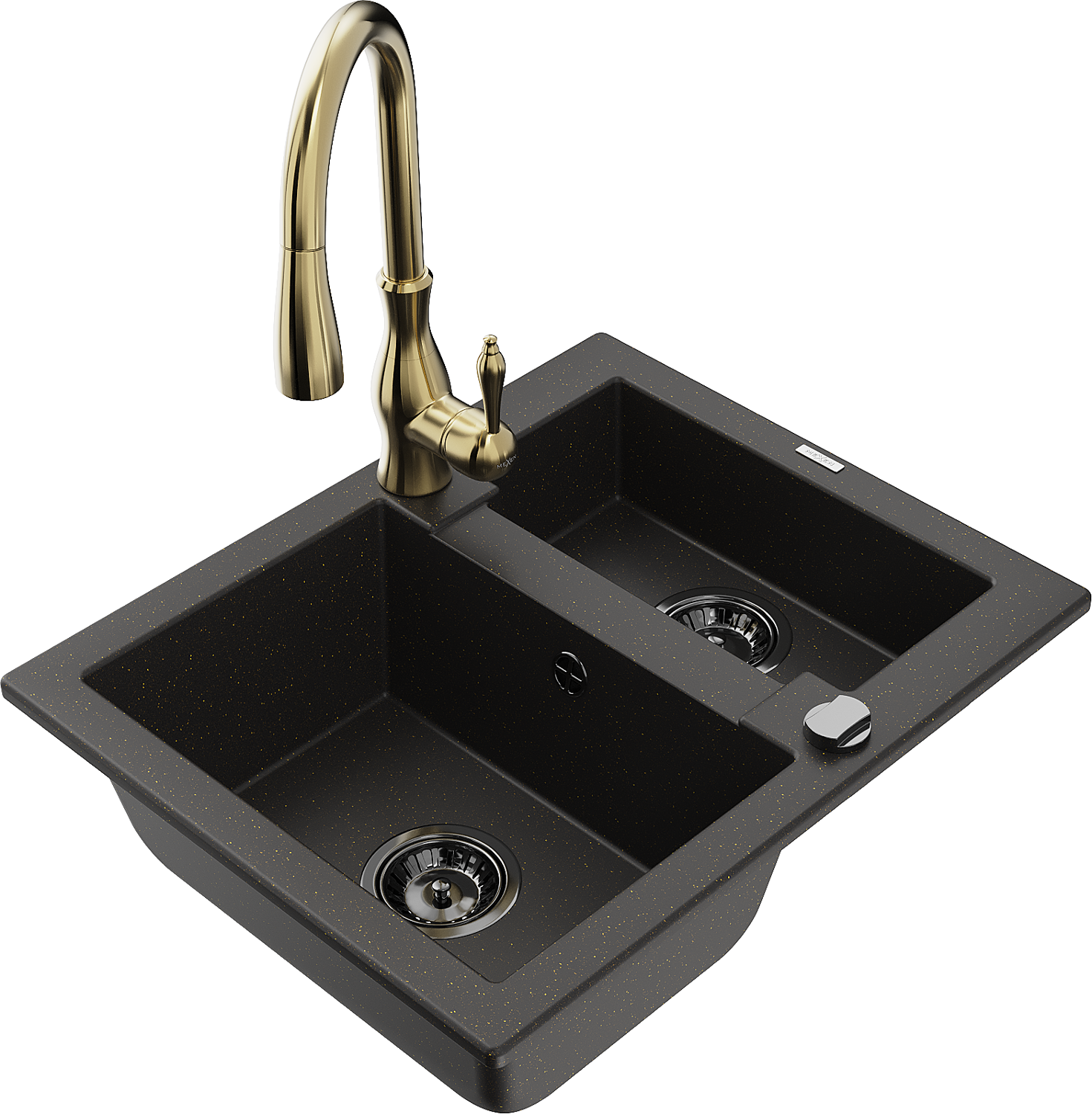 Mexen Carlos granitový dřez 1,5-komorový s kuchyňskou baterií Savita, černý/zlatý metalik - 6518-75-672601-50-B