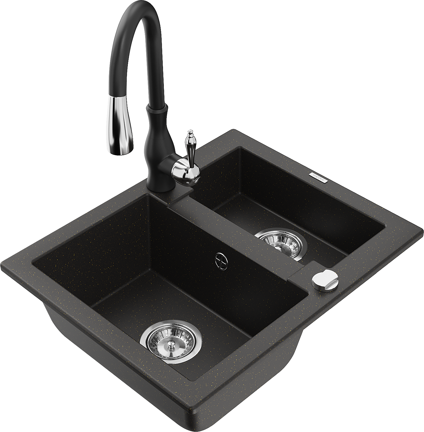 Mexen Carlos granitový dřez 1,5komorový s kuchyňskou baterií Savita, černý/zlatý metalik - 6518-75-672601-70