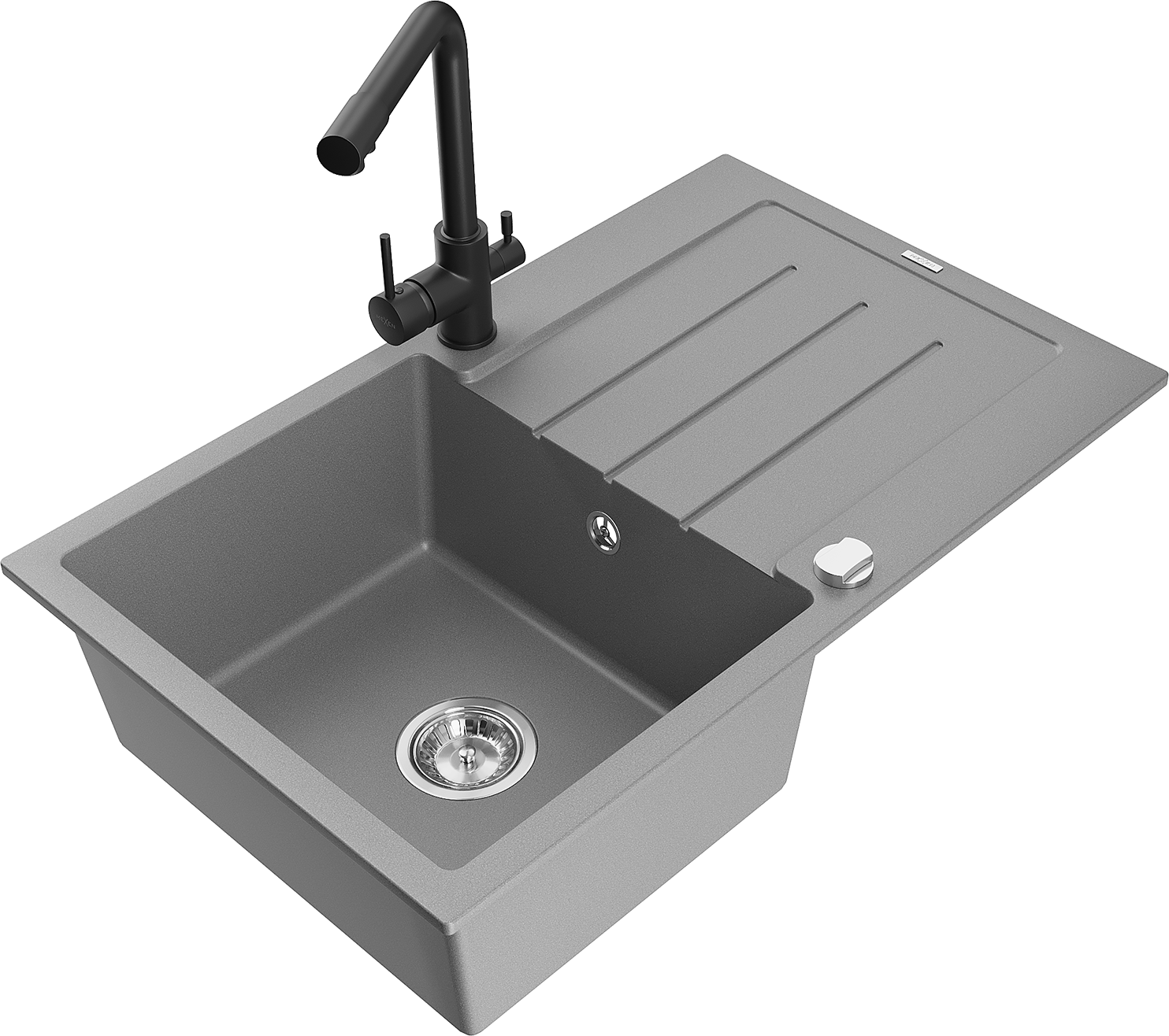 Mexen Bruno granitový dřez 1-komorový s odkapávačem a kuchyňskou baterií Duero, šedý - 6513-71-671600-70