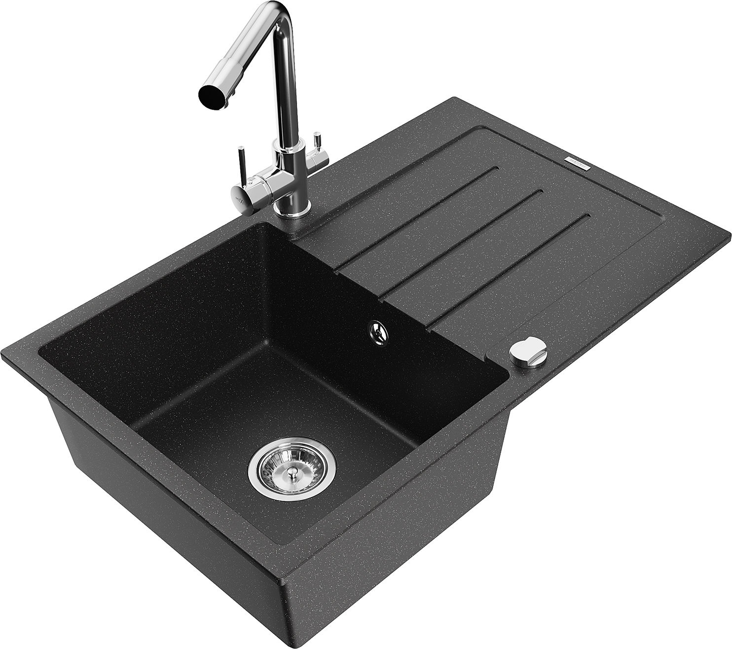 Mexen Bruno granitový dřez 1-komorový s odkapávačem a kuchyňskou baterií Duero, černý/stříbrný metalik - 6513-73-671600-00