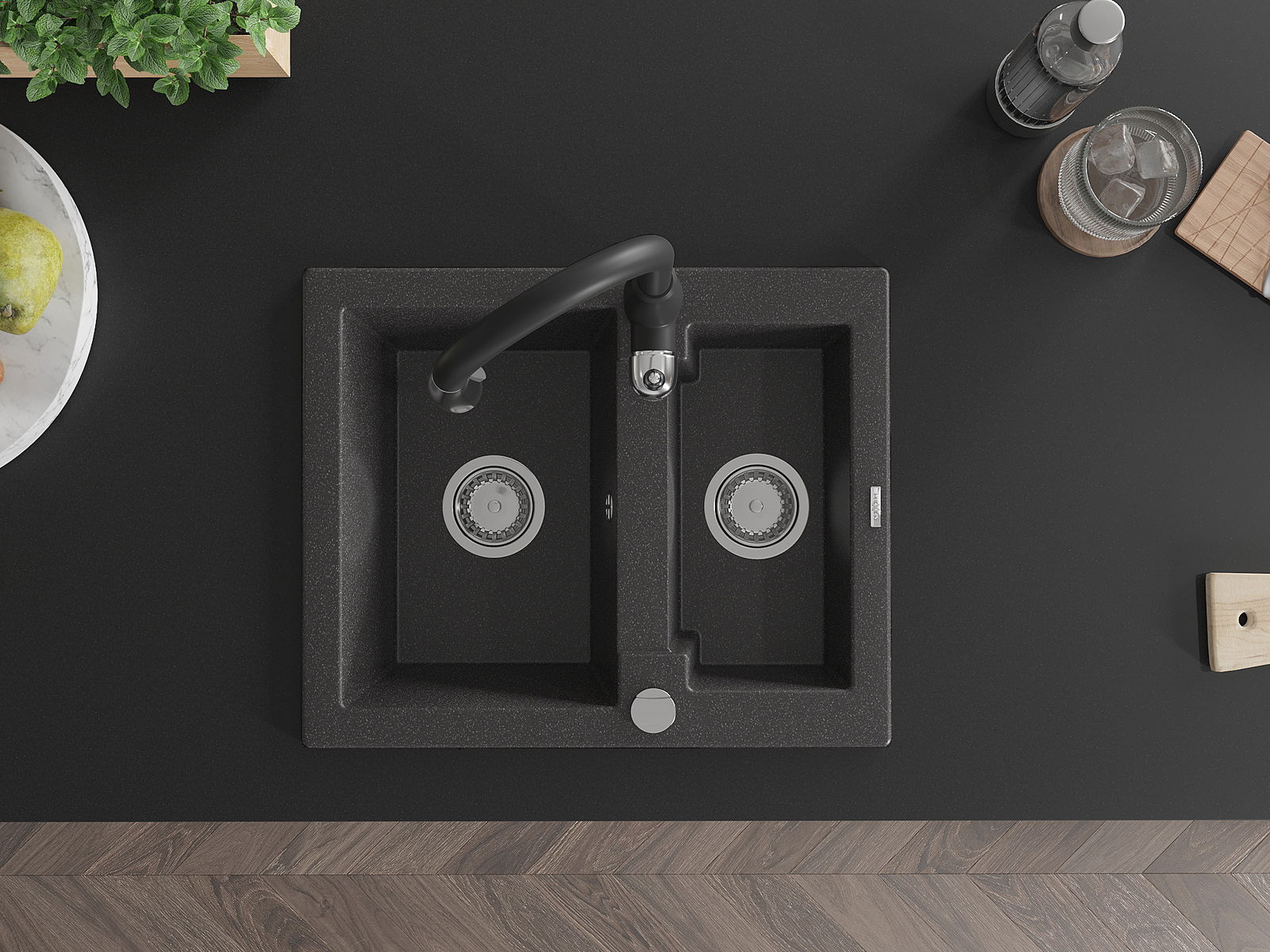 Mexen Carlos žulový dřez 1,5-komorový s kuchyňskou baterií Savita, černý s tečkami - 6518-76-672601-70